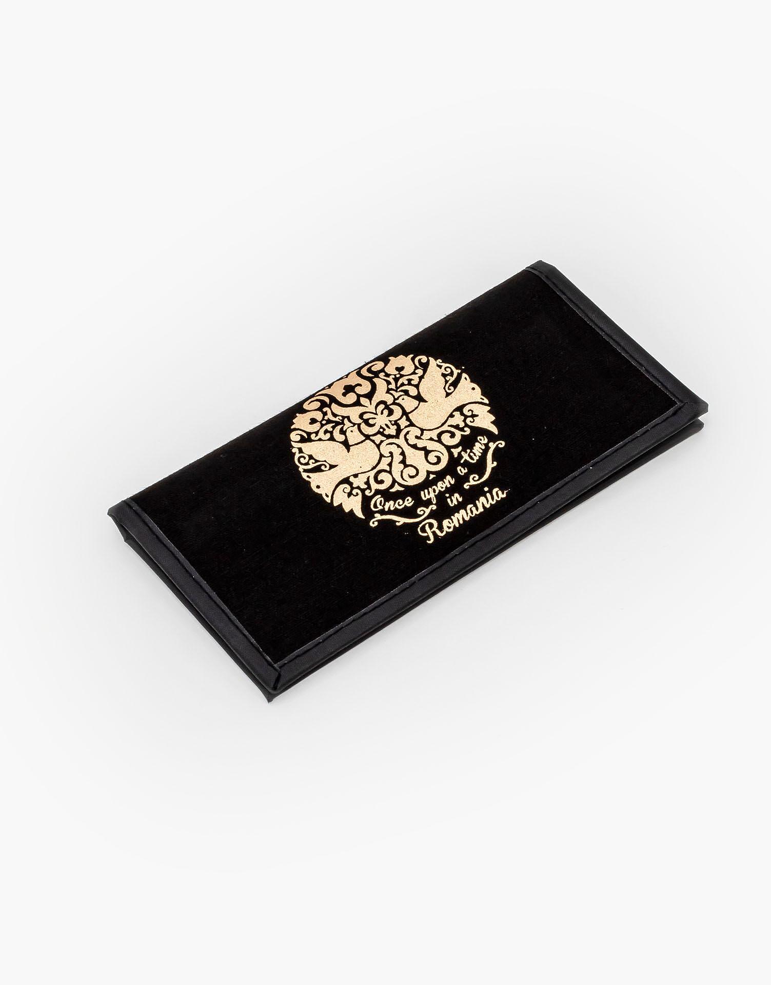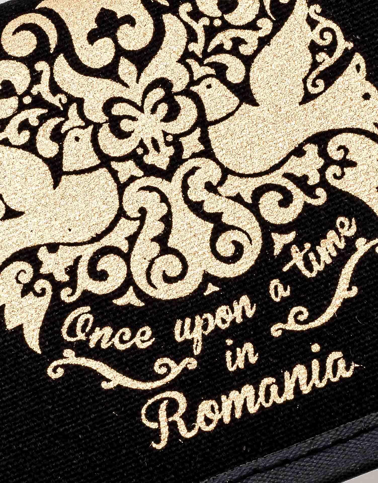 Este confectionat din bumbac negru si are imprimat, cu auriu, logo-ul „Once Upon a Time in Romania”.