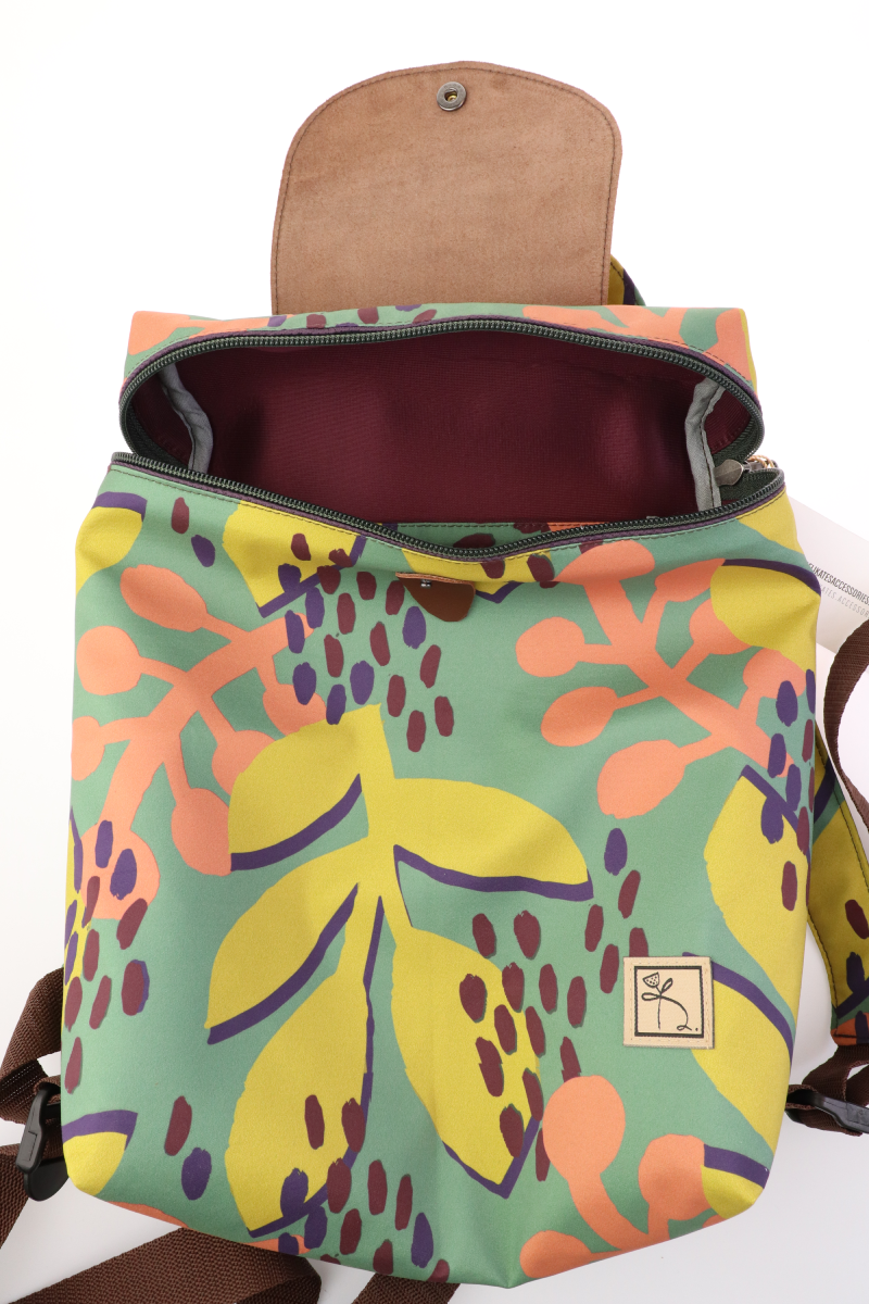 Datorită tehnicii de transfer, chiar și părțile texturate sunt durabile și pot fi spălate. Ghiozdanele sunt căptușite cu un burete presat, datorită cărora își păstrează forma. Partea de sus a rucsacului este realizată din piele naturală și se închide cu o capsă. Bretelele au 90 cm, sunt ajustabile și sunt create din chingă 100% polipropilen. Rucsacul are un buzunar în interior.