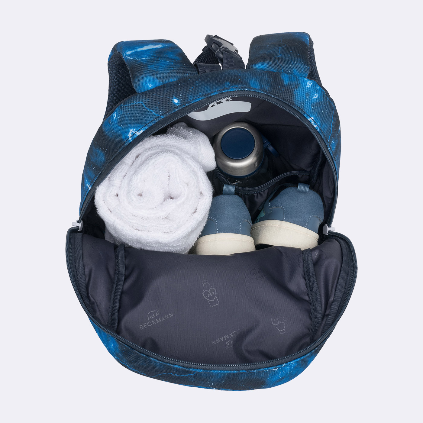 Rucsacul de drumetie poate fi folosit separat sau poate fi atasat simplu si ergonomic de rucsacul scolii. Aceasta inseamna ca mainile sunt mentinute libere si evita distributia neuniforma a greutatii. Rucsacul are pete reflectorizante pe toate partile, suport pentru sticle, centura de sold si curea pentru piept, ceea ce il face ideal pentru excursii de o zi si drumetii mai scurte.