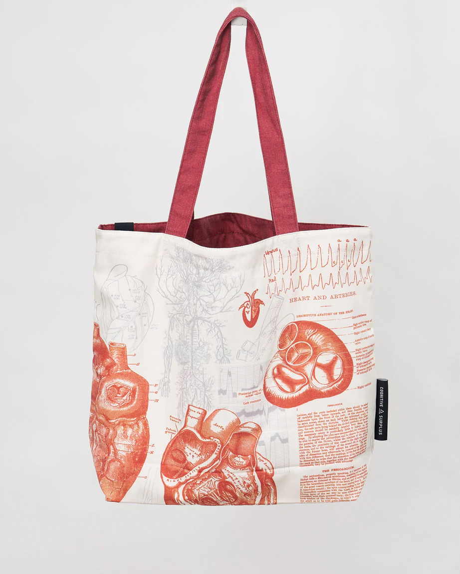 Această geantă robustă din pânză este reversibilă, cu culoarea roșu uni și un buzunar cu fermoar pe o parte, sau o poți întoarce și purta cu designul imprimat cu inimă pe exterior, pentru ca toată lumea să o vadă.