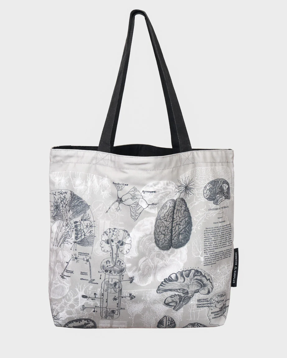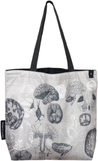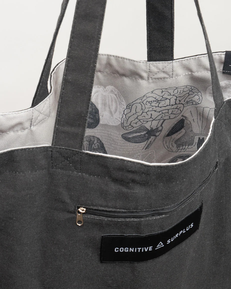 Această geantă robustă din pânză este reversibilă, cu o culoare simplă gri închis și un buzunar cu fermoar pe o parte, sau o poți întoarce și purta cu designul imprimat cu creierul pe exterior, pentru ca toată lumea să o vadă.