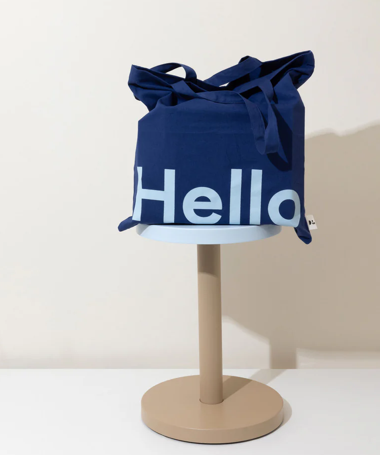 Acest tote bag albastru din bumbac de la Design Letters, cu textul prietenos „Hello” imprimat în stil minimalist, este alegerea perfectă pentru cumpărături, plimbări în oraș sau pentru birou.