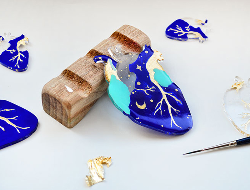 Brosele sunt lucrate manual, din plexiglas si cu detalii de foita de aur, pictate cu acrilice si guase, iar apoi finisate cu un strat bombat de rasina epoxidica.