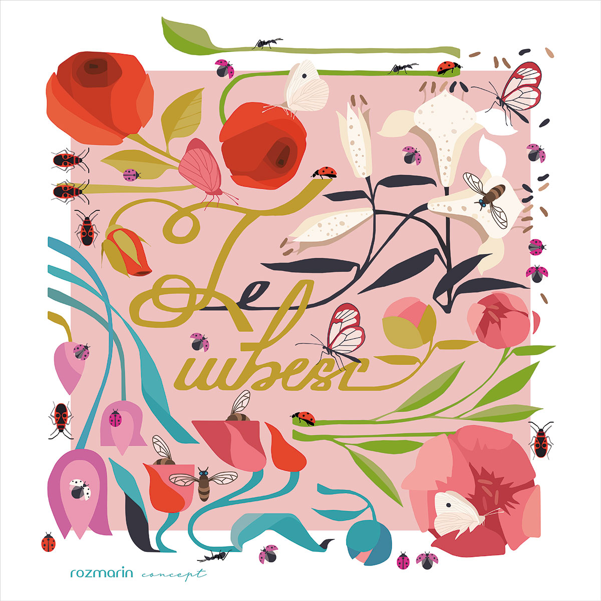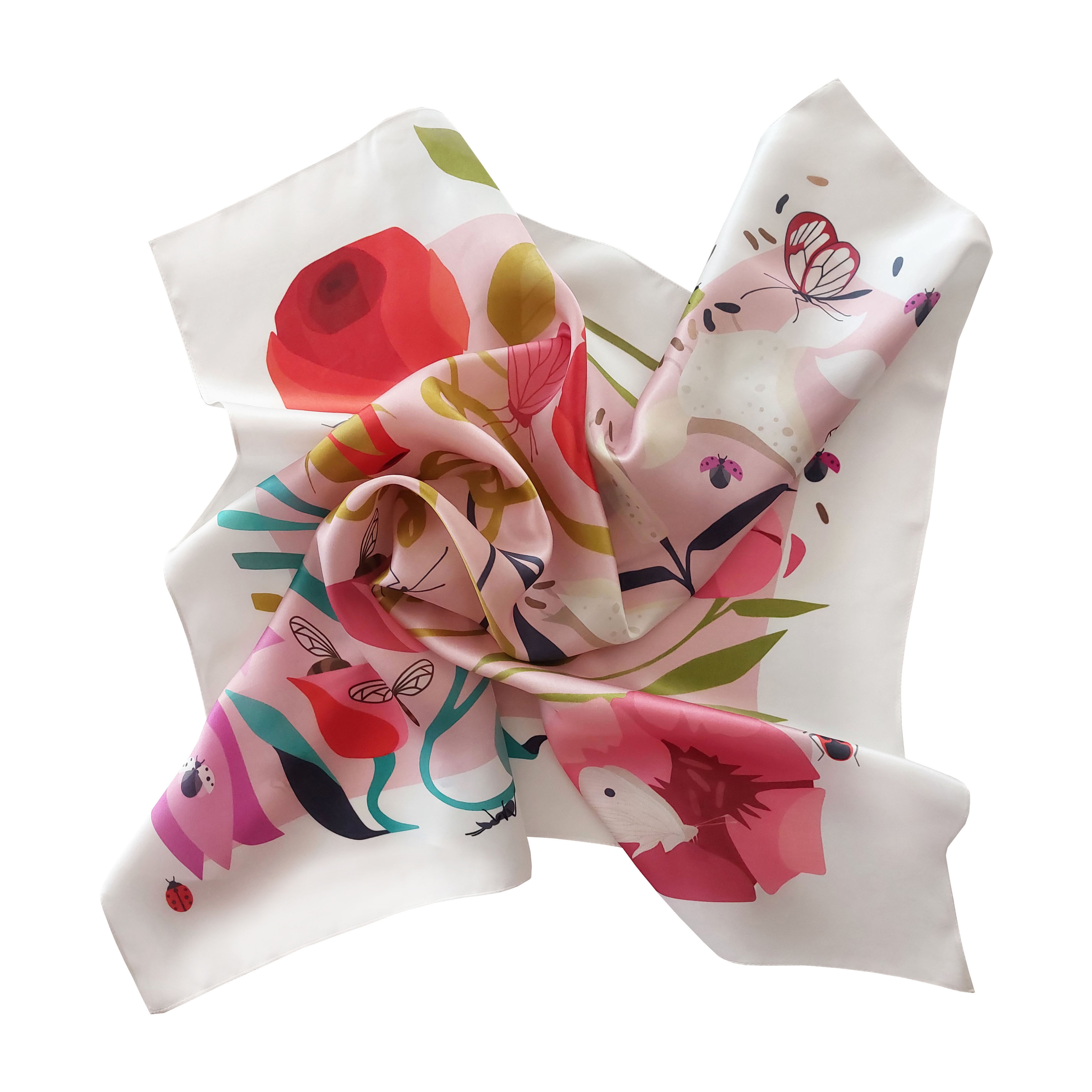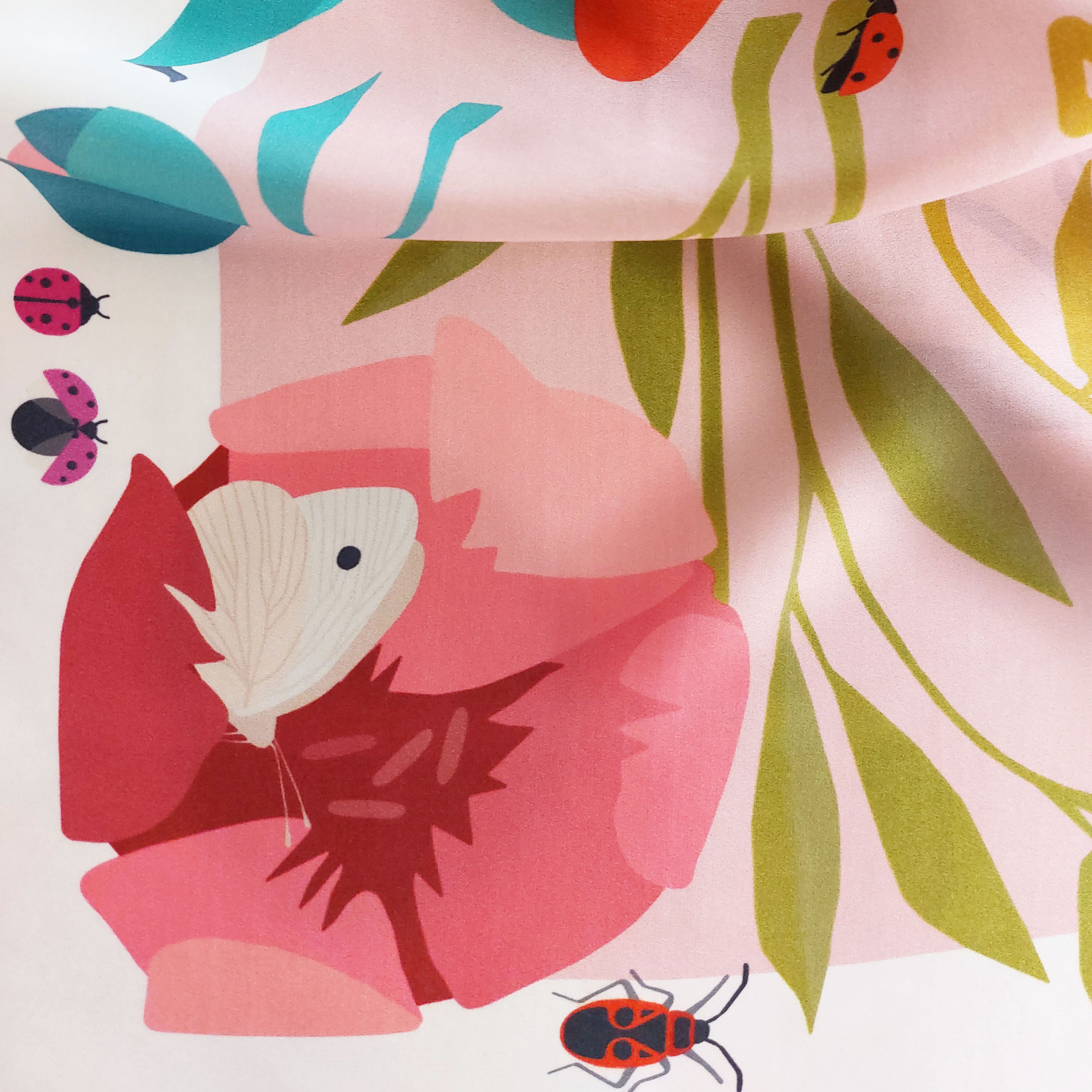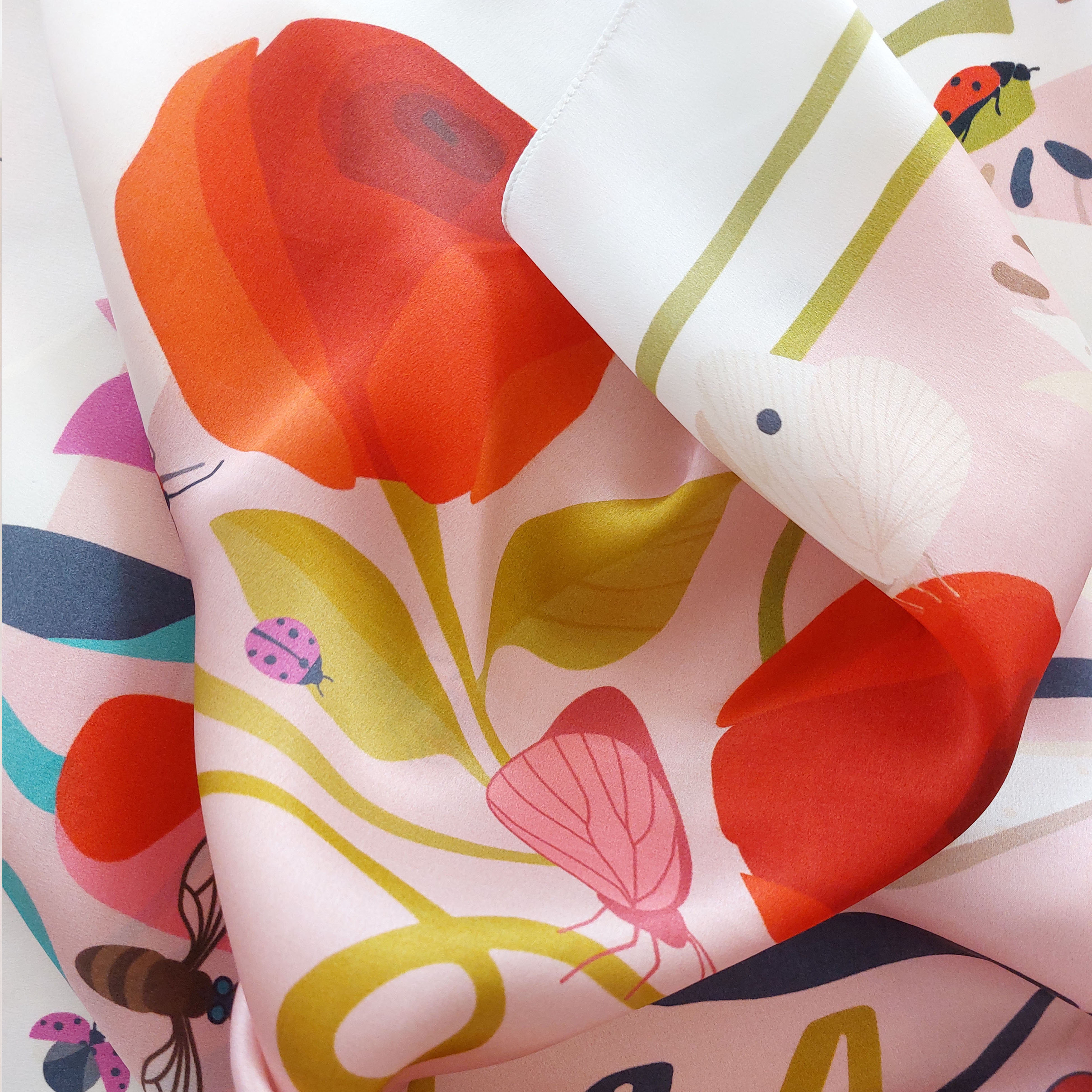Eșarfa TE IUBESC este o grădină cu flori și gâze, romantică, delicată şi fremătând de viață.