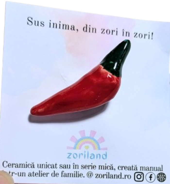 Brosa ceramica modelata si pictata manual, in forma de ardei iute. Prindere inox