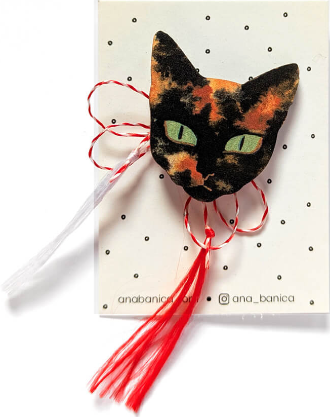 Broșă cu portrete de pisici pictate de Ana Bănică și imprimate UV pe suport HDF
