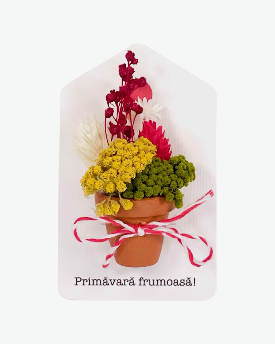 În ghivece micuțe din ceramică au crescut cele mai frumoase și viu colorate flori, flori prezervate și uscate ce vestesc primăvara.