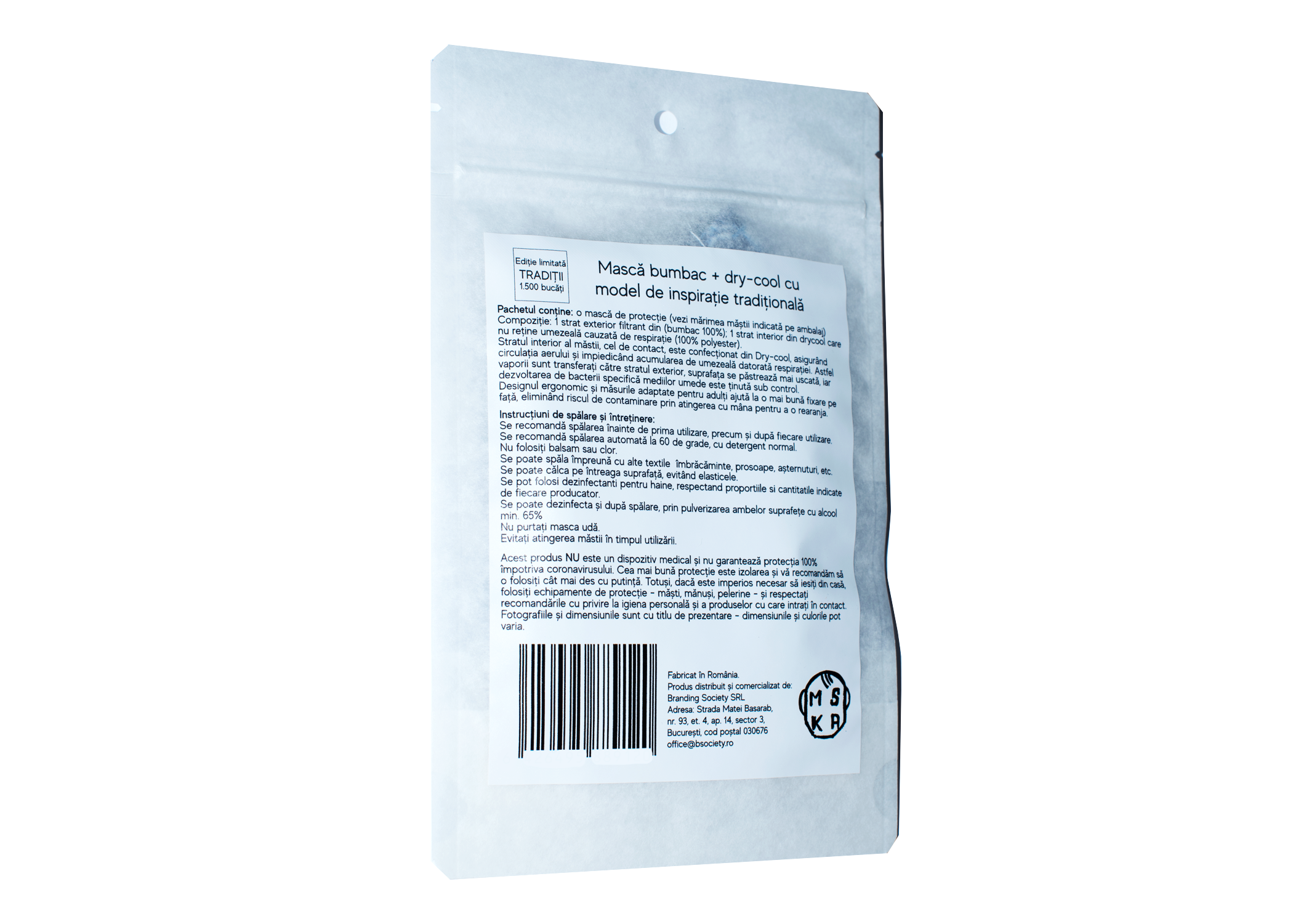 Masca textila este confectionata in editie limitata de 1500 bucati per model.