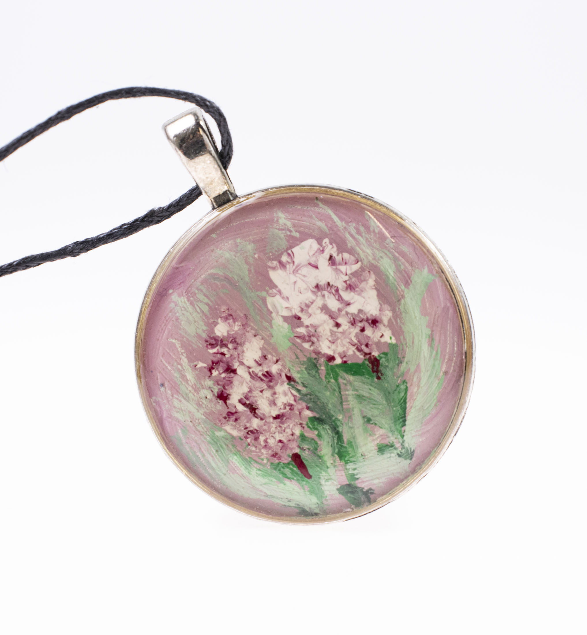 Pandantivul este realizat pe baza metalica rotunda din aliaj pictata manual.