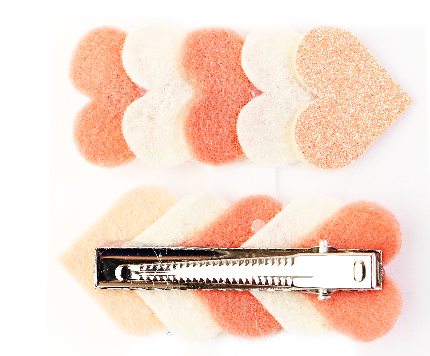 Clamele cu inimi sunt realizate manual din fetru. Au prinderea pe clama de tip aligator. Material: fetru cu continut 60% lana si 40% vascoza, care nu este tratat chimic si nu este daunator sanatatii.