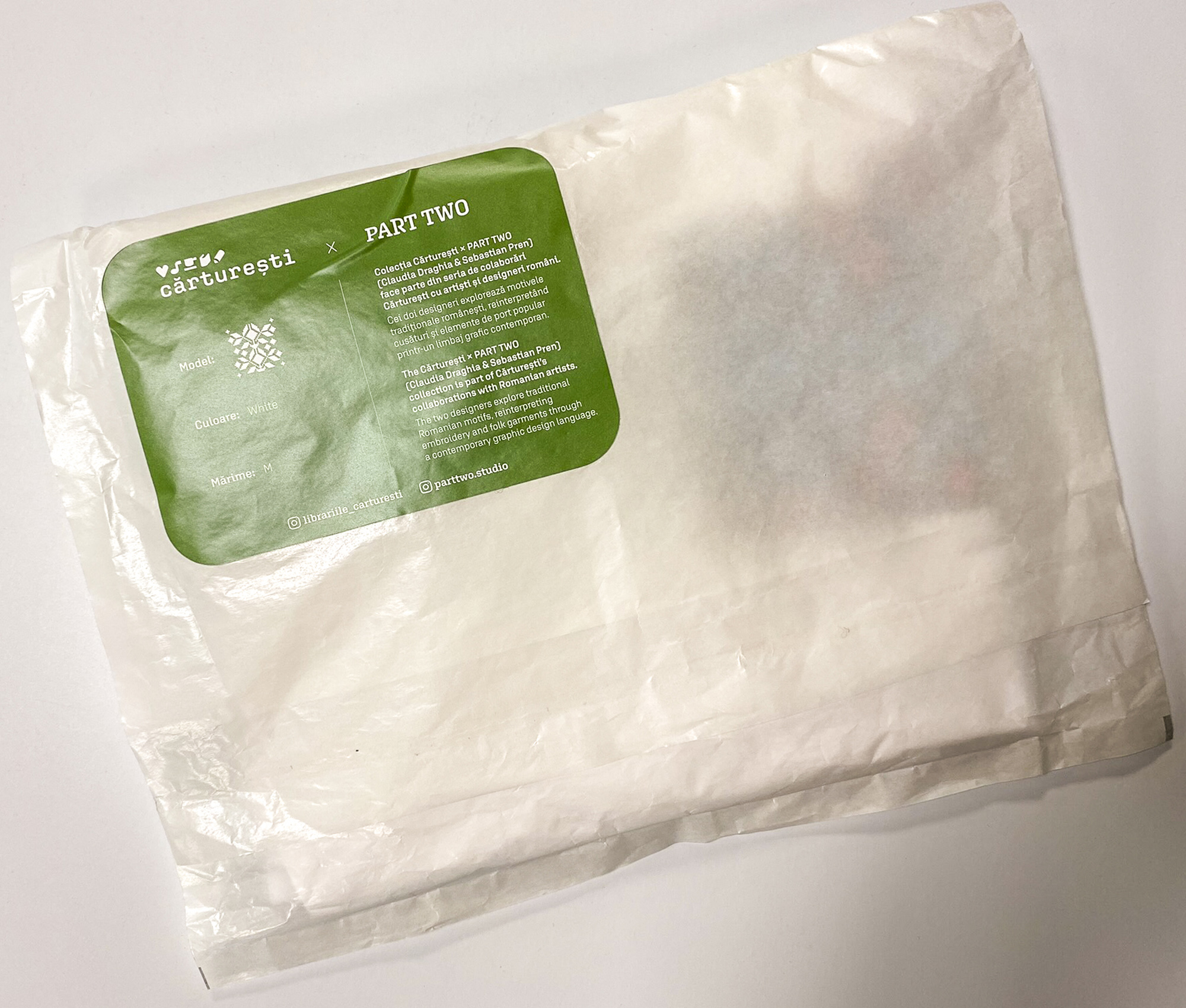 Colecția de tricouri Cărturești x PART TWO (Claudia Draghia & Sebastian Pren) face parte din seria de colaborări Cărturești cu artiști și designeri români. Cei doi designeri explorează motivele tradiționale românești, reinterpretând cusături și elemente de port popular printr-un limbaj grafic contemporan. Pentru cea mai recentă serie din Colecția Cărturești, ne-am propus să redescoperim motive românești, explorând portul popular și cusăturile tradiționale, din perspectiva designului grafic contemporan. Proiectul a pornit din dorința de a readuce în cotidian o parte din patrimoniul cultural imaterial - motivele tradiționale - , broderiile și țesăturile românești fiind una dintre sursele fascinante de inspirație și descoperire a identității și creativității naționale. Primele motive recreate de Claudia și Sebastian s-au inspirat din cusături tradiționale din Bucovina (Băișești, Zaharești) și elemente specifice portului popular din Moldova (Roman, Neamț). Seria va continua. Sebastian Pren, ilustrator și designer grafic are un stil recognoscibil bazat pe forme geometrice, contraste puternice și compoziții riguroase. Proiectele sale, între grafică, design și artă murală, sunt versatile, dar păstrează o identitate coerentă, consolidată prin inițiativele personale care i-au definit limbajul vizual. Claudia Draghia, designer grafic, se concentrează pe evenimente culturale, postere și proiecte editoriale. Colaborarea lor, începută în 2021, a produs identități vizuale și proiecte pentru diverse instituții culturale.) Material: 100% bumbac, 190 gr/mp