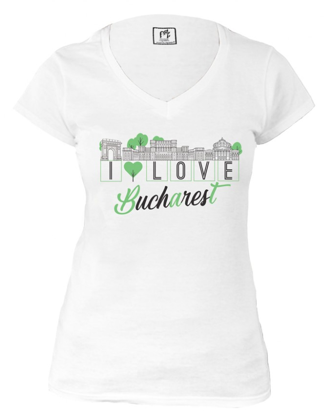 Desenul ilustrează cele mai cunoscute edificii ale capitalei României – Palatul Parlamentului, Arcul de Triumf și Ateneul Român.