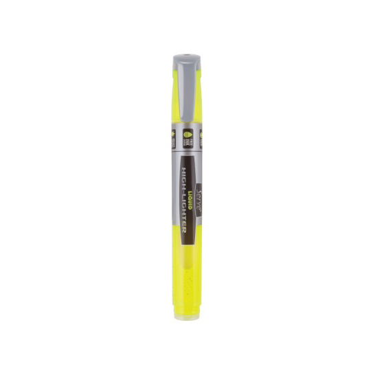 Textmarker cu cerneala lichida, varf special, tesit, pentru a permite variatie in grosimea liniilor trasate (intre 1 mm si 5,5 mm), cerneala pigmentata pe baza de apa cu intensitate constanta a culorii, corp transparent cu gradatie si vizualizare a nivelului cernelii, nu curge, poate fi folosit timp indelungat in mod intensiv si fara capac, fara risc de uscare a varfului, poate fi folosit cu orice fel de hartie, culoare galben.