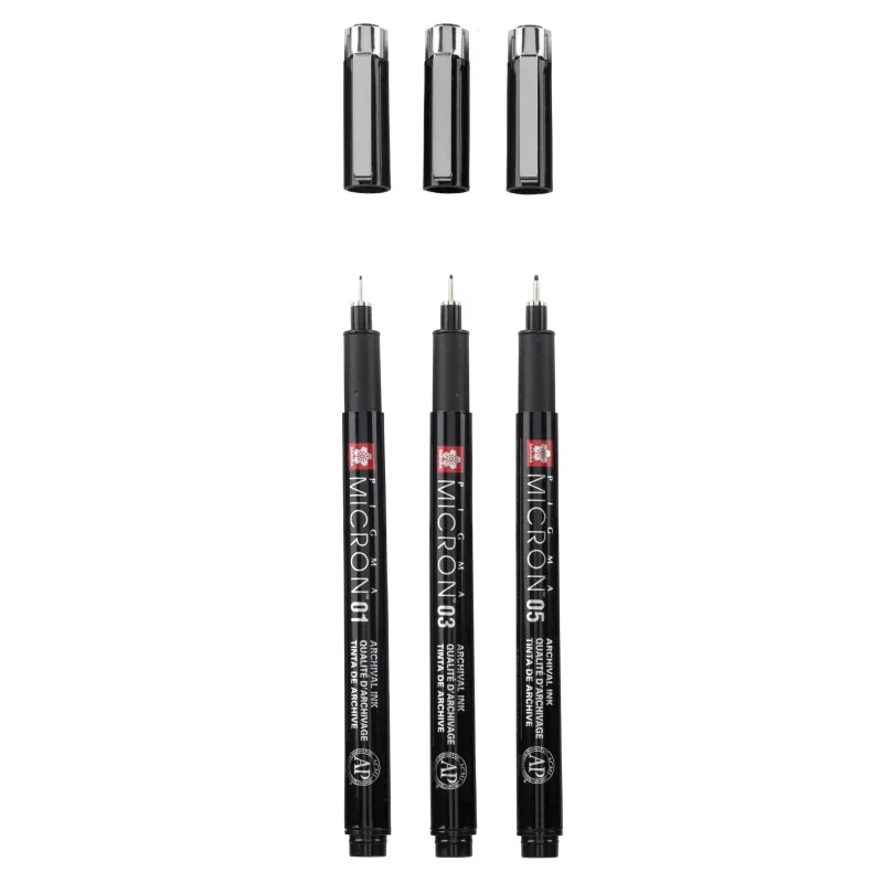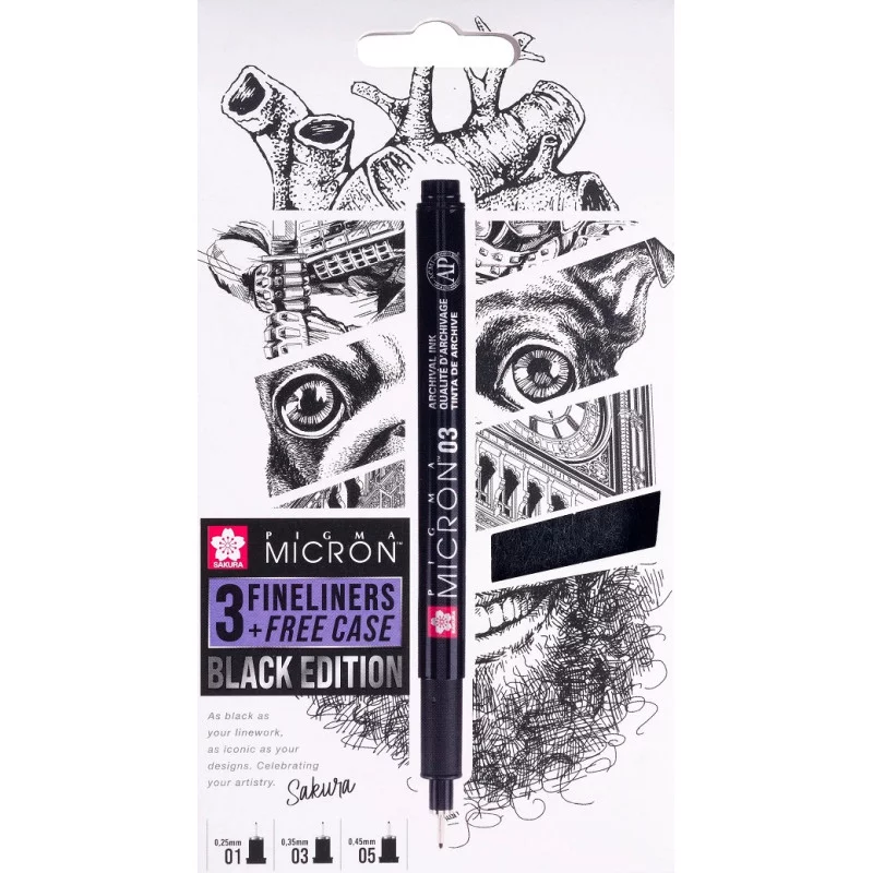 Fineliner-urile preferate de designeri, Pigma Microns, sunt acum disponibile într-o ediție specială Black Edition. Nu ratați această versiune la modă, complet neagră, a stiloului stilou, cu cerneala neagră de încredere Pigma. Acest set de fineliner Pigma Micron Black Edition include și o husă pentru stilou gratuit. Acest set conține 3 fineliner Pigma Micron cu dimensiunile penei: 1 x 01 (0,25 mm), 1 x 03 (0,35 mm) și 1 x 05 (0,45 mm). Husa pentru stilouri este durabilă, realizată din poliester post-consum. Are o textură gri închis la culoare, un buton cu apăsare și o etichetă Sakura cusută șic. Suplimentul perfect pentru lucrul esențial al oricărui ilustrator. Acest suport convenabil pentru stilou este suficient de mic pentru a fi plasat cu grijă într-un buzunarul jachetei sau în geantă; un accesoriu grozav pentru artiștii din mers.