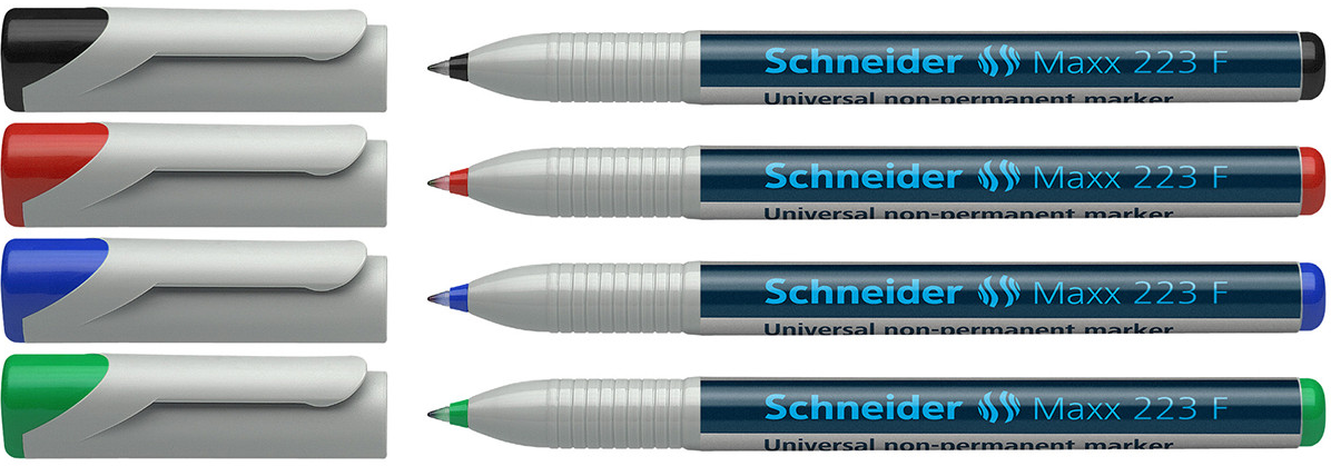 Marker universal nepermanent, lățime de linie fină (F) aprox. 0,7 mm. Portofel cu 4 piese: negru, rosu, albastru, verde. Pentru scris pe folii transparente (OHP), hârtie, plastic, sticlă, metal și aproape toate celelalte materiale. Acest marker nepermanent este ideal pentru birou, la școală sau în afaceri de artizanat.