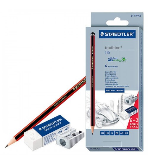 Set compus din 6 creioane 2H, HB, B, 2B, 4B, 6B, o radieră și o ascuțitoare.