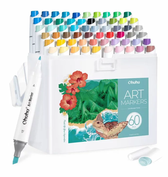 Markere cu alcool Ohuhu Kaala Landscape Colours, cu vârf dublu, subțire, lat și fin. Cerneala de înaltă calitate se amestecă perfect pentru a obține efecte de colorare frumoase, chiar și pentru începători. În plus, lucrările tale de artă nu se vor estompa și nu se vor mânji în timp. 60 de tonuri de culoare Landscape + 1 amestecator de marker cu alcool incolor: Curcubeul este la îndemâna ta - alege dintre 60 de culori Landscape și dai viață ideilor tale.