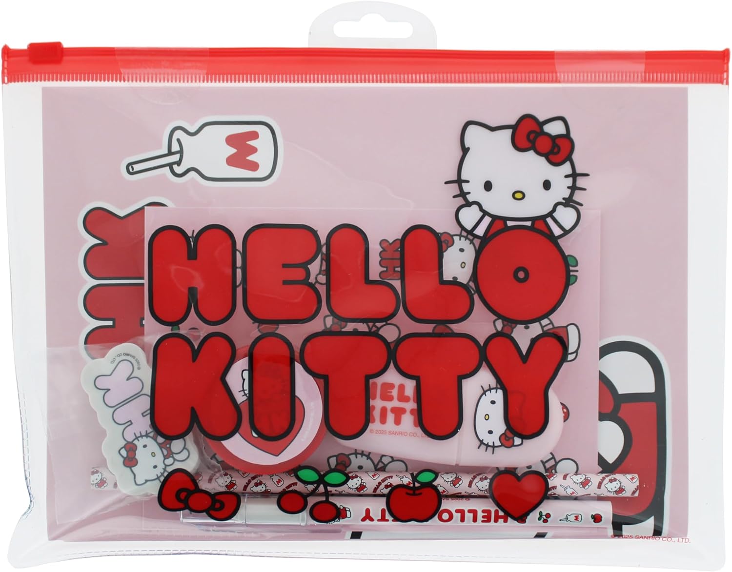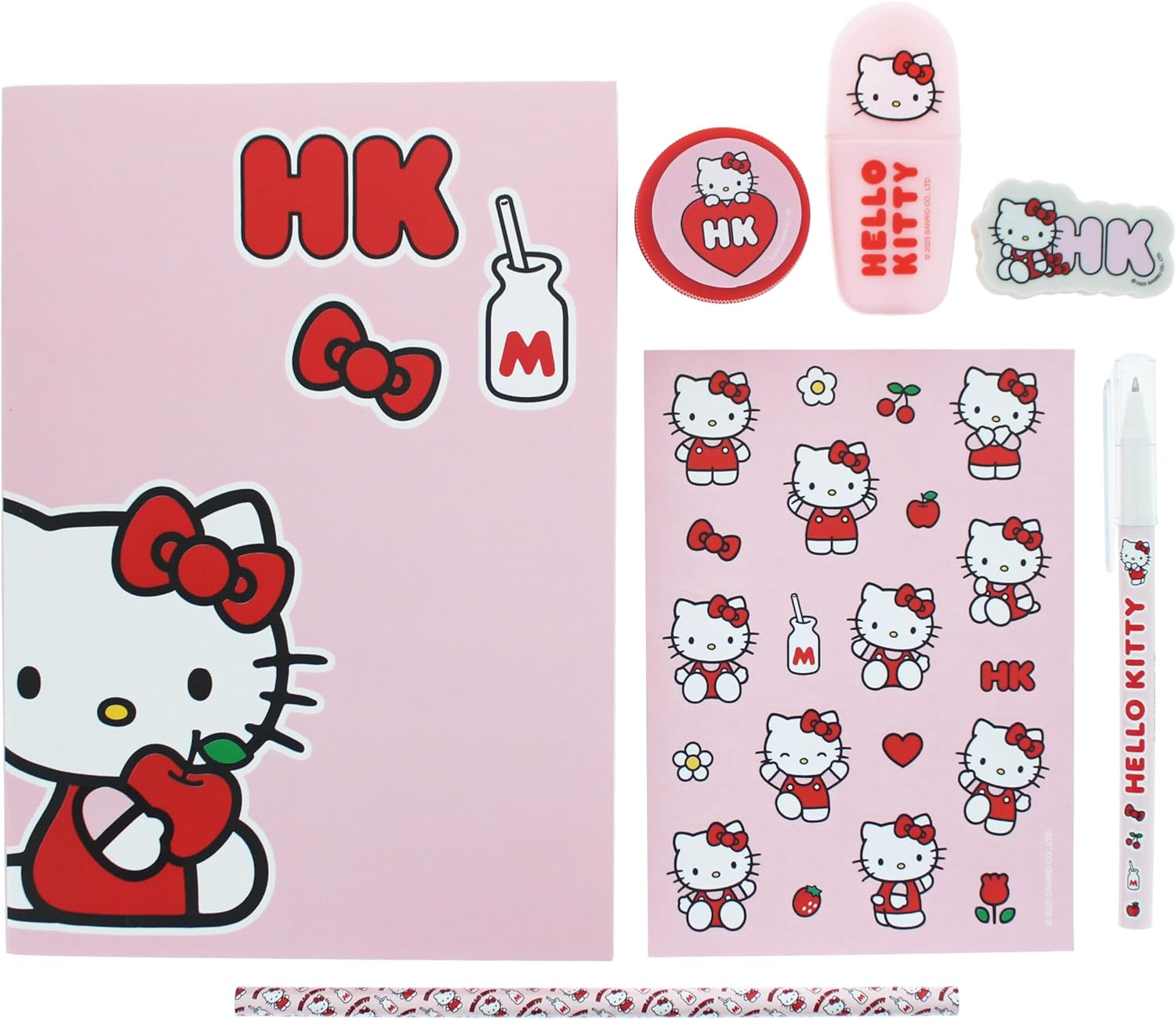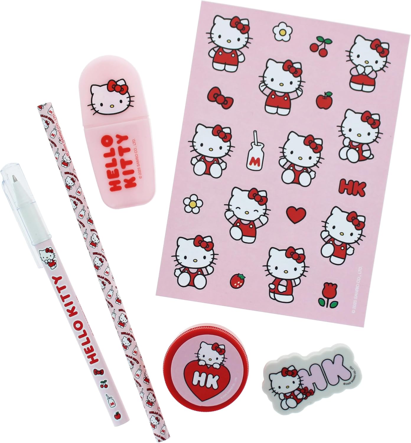 Conține toate articolele esențiale de papetărie de care are nevoie un fan Hello Kitty, inclusiv un caiet A5 liniat, o foaie de stickere, o radieră, un mini marker, un pix, un creion și o ascuțitoare.