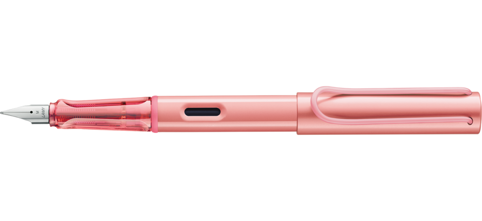 Detalii stilou Lamy AL-star flamingo: aluminiu anodizat autumn pink / clip metalic / grip din plastic ergonomic / penita de otel, slefuita / patroane cerneala Lamy T10 / convertor compatibil Lamy Z28 / NU include convertor Z28