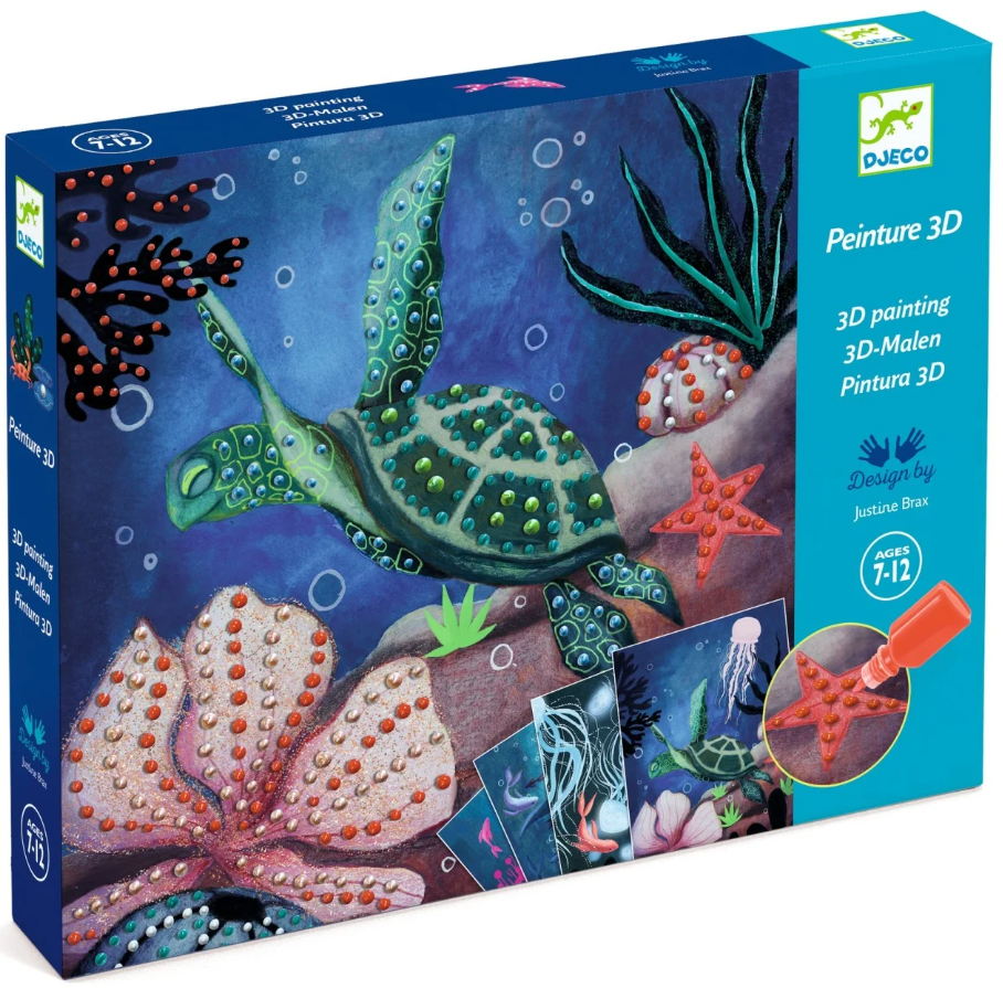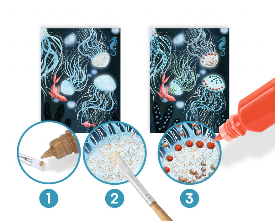 O activitate de pictură 3D pentru a decora 4 animale fantastice. Cu pensula creați linii și puncte în relief pentru o pictură 3D cu detalii strălucitoare.