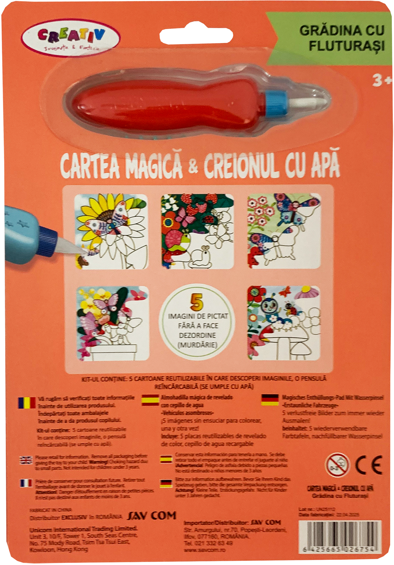 Kit-ul conține 5 cartoane cu imagini diferite, reutilizabile, în care descoperi imaginile; o pensulă reîncărcabilă (care se umple cu apă).