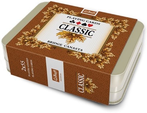 Set 2 pachete carti de joc TREFL. Destinate iubitorilor de canasta si bridge, pachetele de carti vin ambalate intr-o cutie de metal.