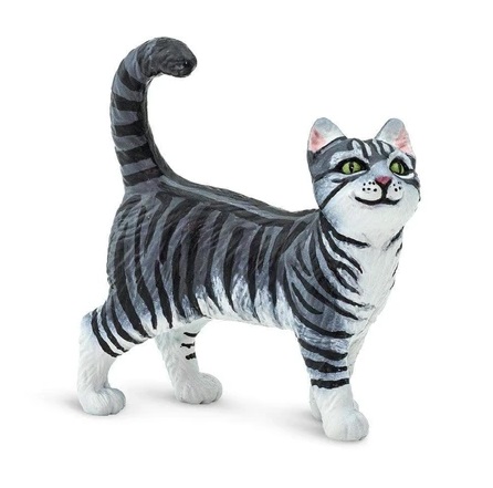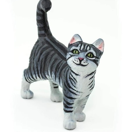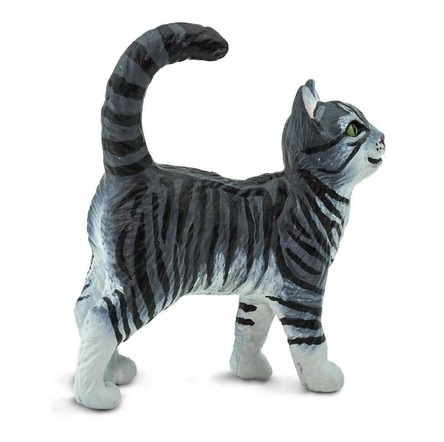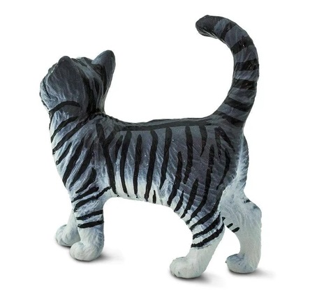 „Tabby” (tigrată) se referă la orice pisică domestică prezentând un model distinctiv cu dungi pe blană, de obicei cu un semn în formă de „M” pe frunte. Dungile pot fi verticale sau pot semăna cu niște pete, iar blana pisicii poate avea orice culoare. Se consideră că modelul tabby este originar dintr-o subspecie a pisicii sălbatice (Felis silvestris), strămoșul pisicii domesticite (Felis catus sau Felis silvestris catus), iar pisicile tabby sunt găsite în documente încă din epoca medievală. „Ithaca Kitty” din 1892, una dintre primele jucării de pluș care a devenit populară în Statele Unite, s-a bazat pe o pisică cenușie tigrată numită Caesar Grimalkin. Ați putea să vă imaginați figurina noastră cenușie tabby ca un succesor al acestui animal de jucărie care a pornit un trend cu privire la animalele de jucărie cu peste 100 de ani în urmă.