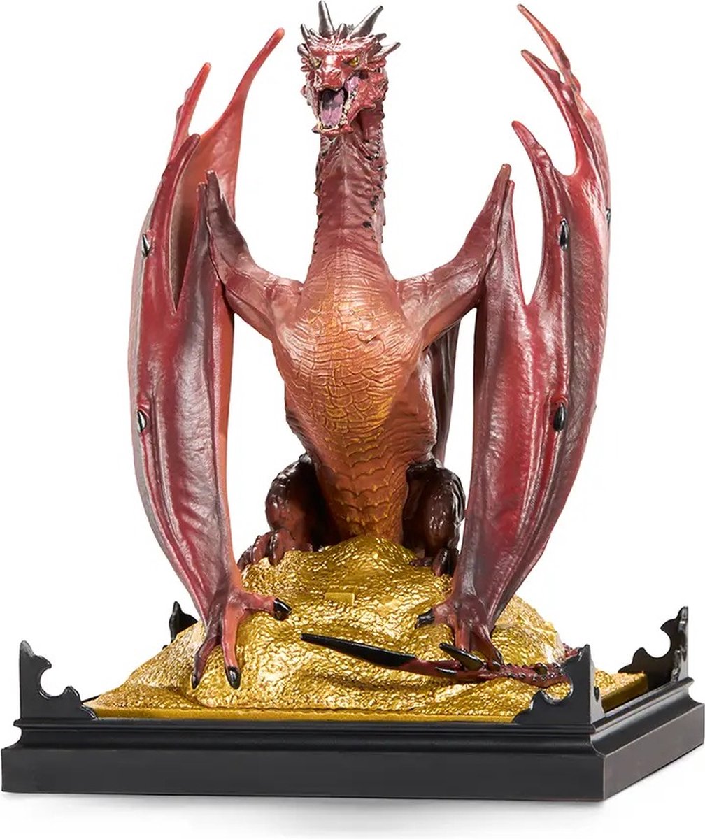 Această figurina din trei părți include un capac cu fundal, o bază și o figură detașabilă a dragonului Smaug.