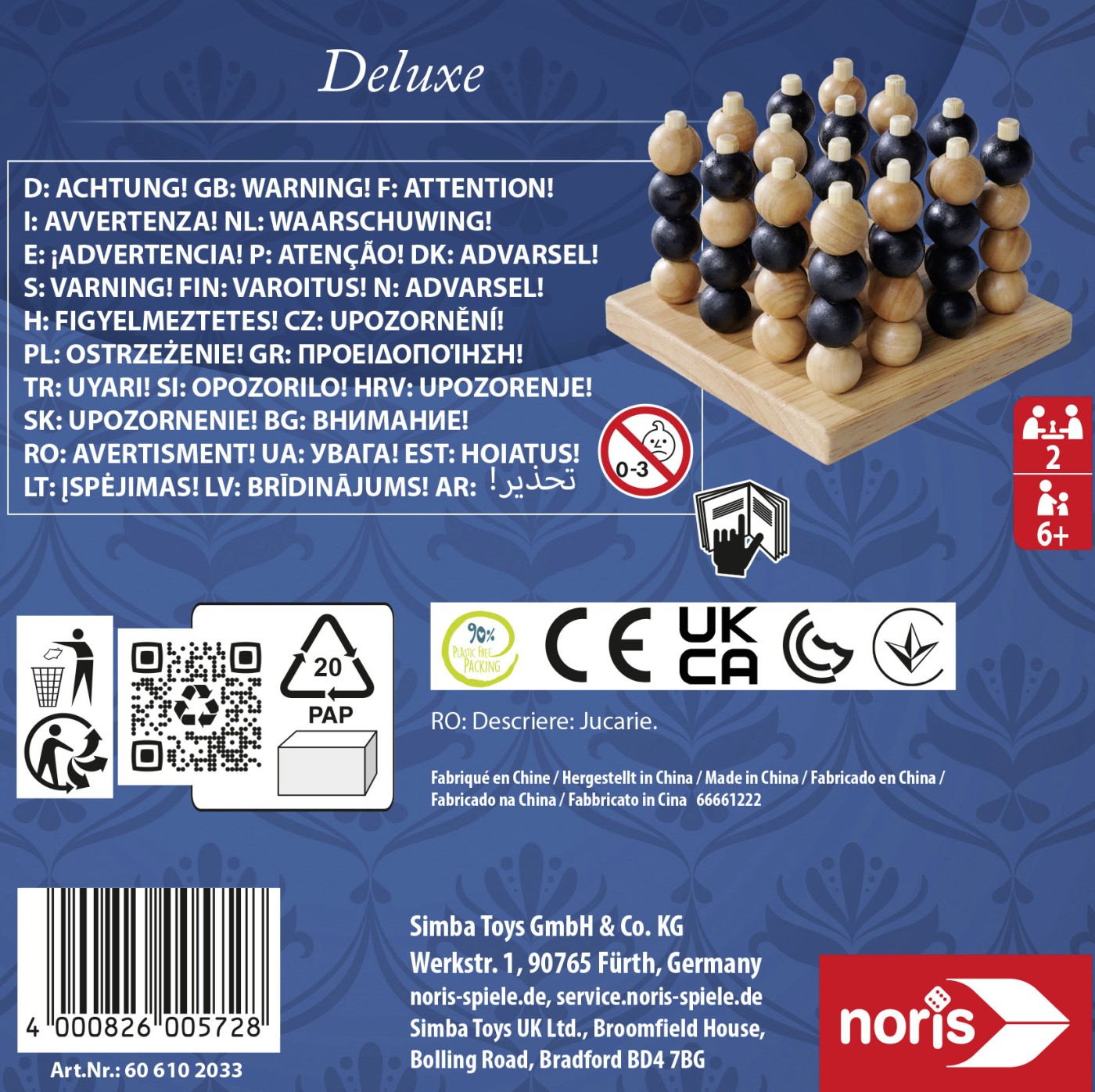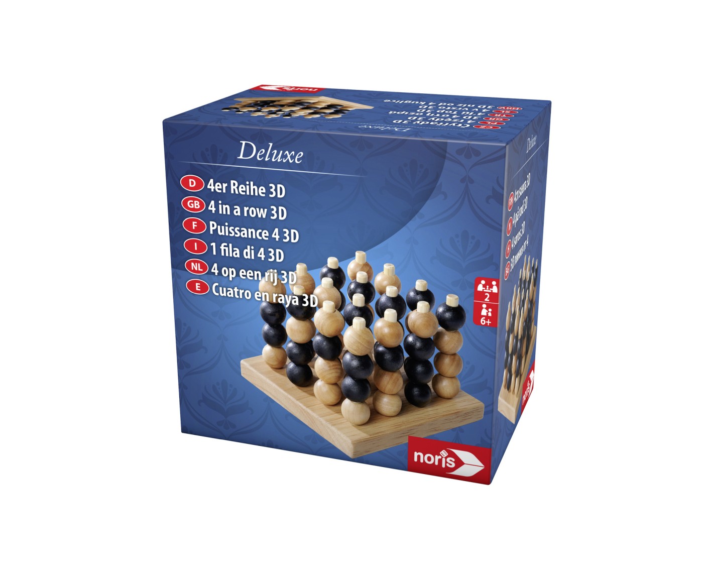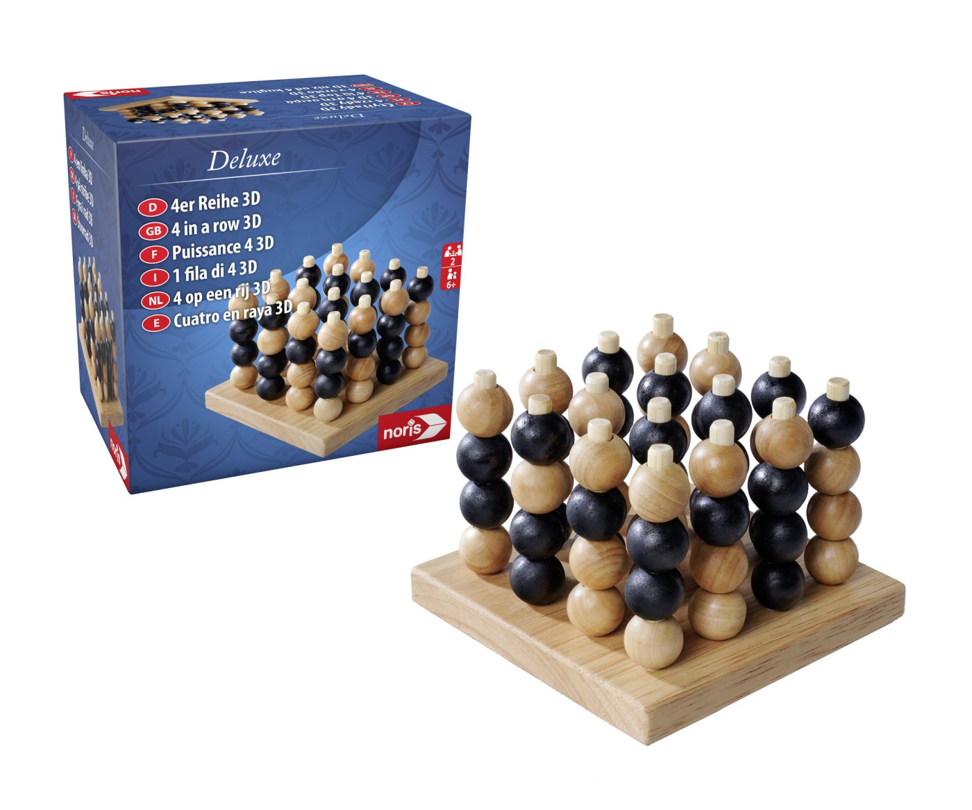 În aceasta versiune de joc Noris, clasicul „4 la rand” impresioneaza prin 2 momente: ca versiune 3D cu bile pentru stivuire si ca editie de lux realizata in intregime din lemn.