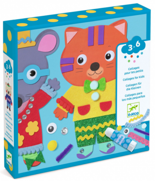 Conținut: 4 planșe personaje realizate din carton gros (18 x 23 cm), lipici, tot felul de obiecte de lipit (pâslă, spumă, paiete, panglici, bobulețe), broșură cu instrucțiuni pas cu pas.