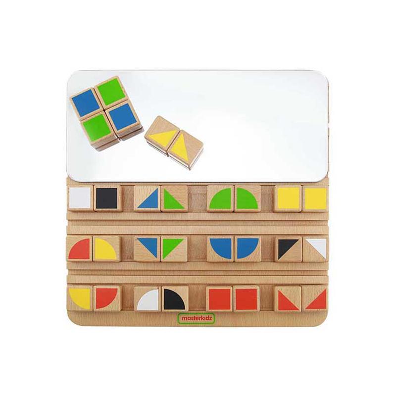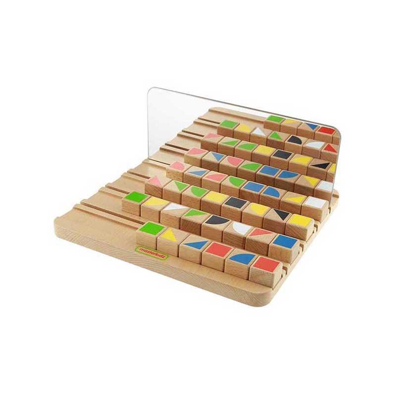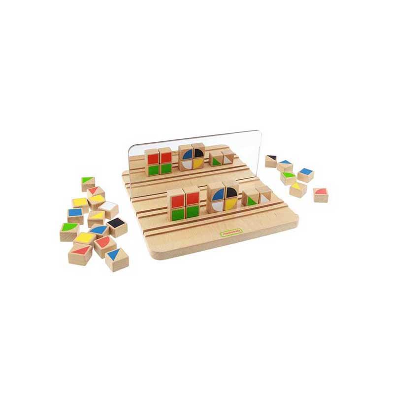 Lucrurile arată altfel în oglindă, iar copiii sunt uimiți când descoperă acest fapt. Setul de cuburi colorate de observat în oglindă cuprinde și o placă-suport cu 4 șine unde se poate așeza aceasta. Astfel, micuții pot experimenta cu diverse cuburi așezate la distanțe diferite față de suprafața de reflexie. Mai mult, cuburile pot fi așezate de ambele părți ale oglinzii duble. Un joc interactiv și creativ, ce contribuie la dezvoltarea coordonării mână-ochi, percepției vizuale și logicii.