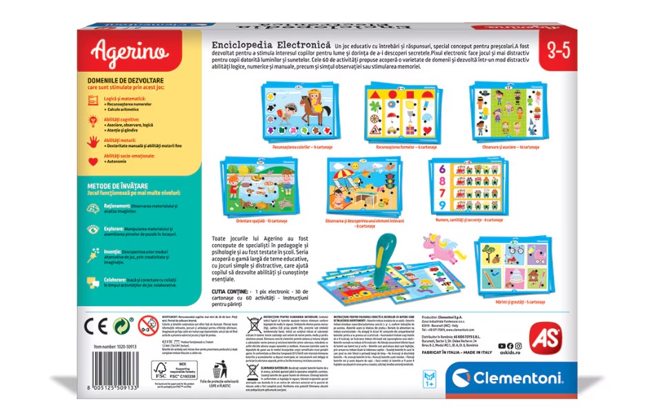 Jocurile educative Agerino sunt o serie atemporala si inovatoare, fiind concepute pentru a sprijini dezvoltarea invatarii copiilor in perioada prescolara si scolara. Au fost studiate de educatori speciali si psihologi si au fost testate in scoli. Acestea acopera o varietate de teme educationale, ajutand copiii sa dezvolte abilitati si cunostinte esentiale intr-un mod simplu si distractiv!