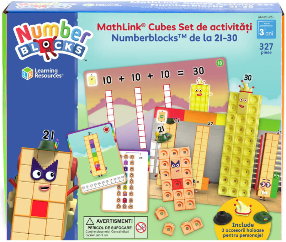 Cu setul de activitati MathLink® Cubes Numberblocks pentru numerele 21-30, copiii vor explora numararea, adunarea, scaderea si multe altele in timp ce construiesc Numberblocks de la 21 la 30.