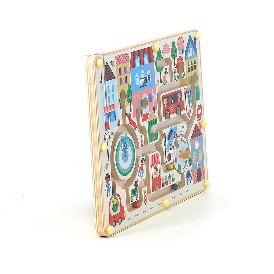 Cu ajutorul unui stilou magnetic, copilul poate muta bilele colorate de pe o stradă pe alta: o bilă verde într-un copac, una roșie în floare și alte două în roțile autobuzului. Distracția devine și mai mare atunci când trece prin sensul giratoriu care trebuie activat.