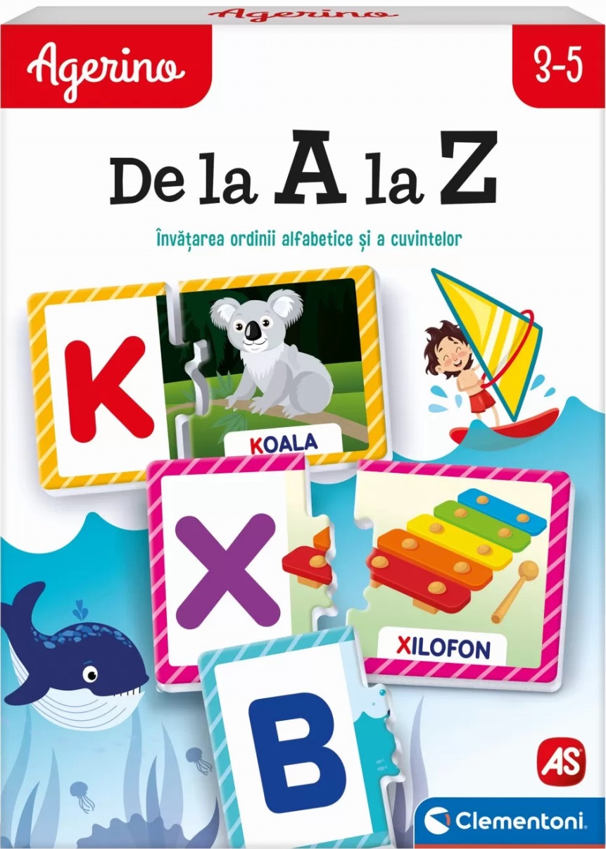 AGERINO DE LA A LA Z Un joc educativ format din piese de puzzle cu litere si lucruri care incep cu aceeasi litera, astfel incat copiii sa invete alfabetul si sa faca legatura litera-cuvant.Mai mult, de indata ce copilul este familiarizat cu literele, poate incepe sa citeasca cuvintele litera cu litera, descoperind astfel cuvantul magic al lecturii!.Valori dezvoltate logica, cunostinte despre lume, autonomia, sociabilitatea, memoria, limba straina, aptitudinile motorii. Toate jocurile lui Agerino au fost concepute de specialisti in pedagogie si psihologie si au fost testate in scoli. Varsta recomandata 3+.