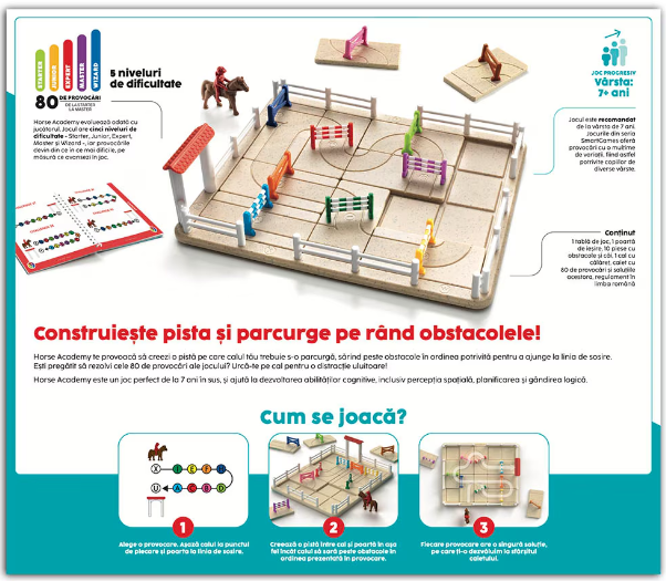 Contine: 1 tabla de joc, 1 piesa calaret cu cal, 9 piese traseu cu obstacol, 1 poarta de finish si 1 brosura cu 80 de provocari si solutii.