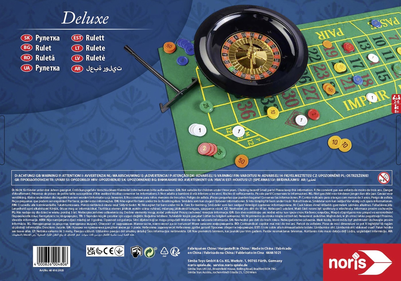 Setul include: 120 de jetoane: 20 albe, 20 rosii, 20 galbene, 20 verzi, 20 albastre, 20 portocalii, 1 dealer, 1 minge de joc, 1 tabla de joc portabila cu imprimeu, 25 cm. Joc potrivit copiilor peste 8 ani +.