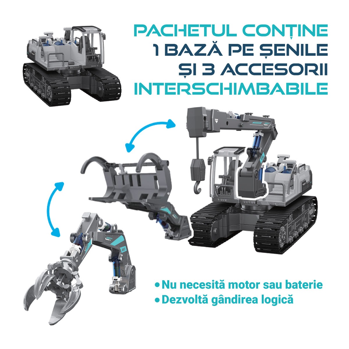 • Conține o bază pe șenile și 3 accesorii interschimbabile. Astfel, copiii pot monta rapid fiecare model, bucurându-se de 3 jucării într-un singur set.