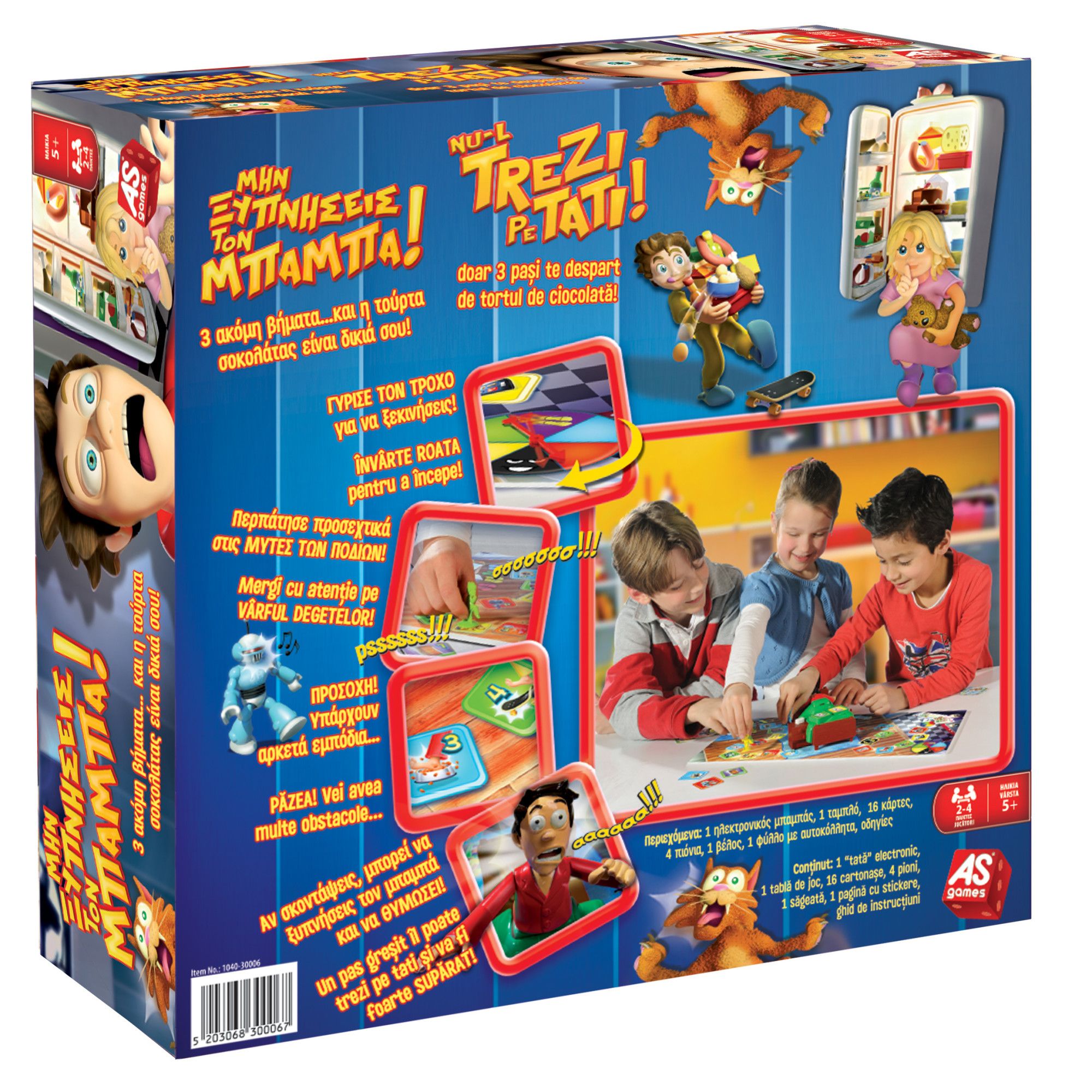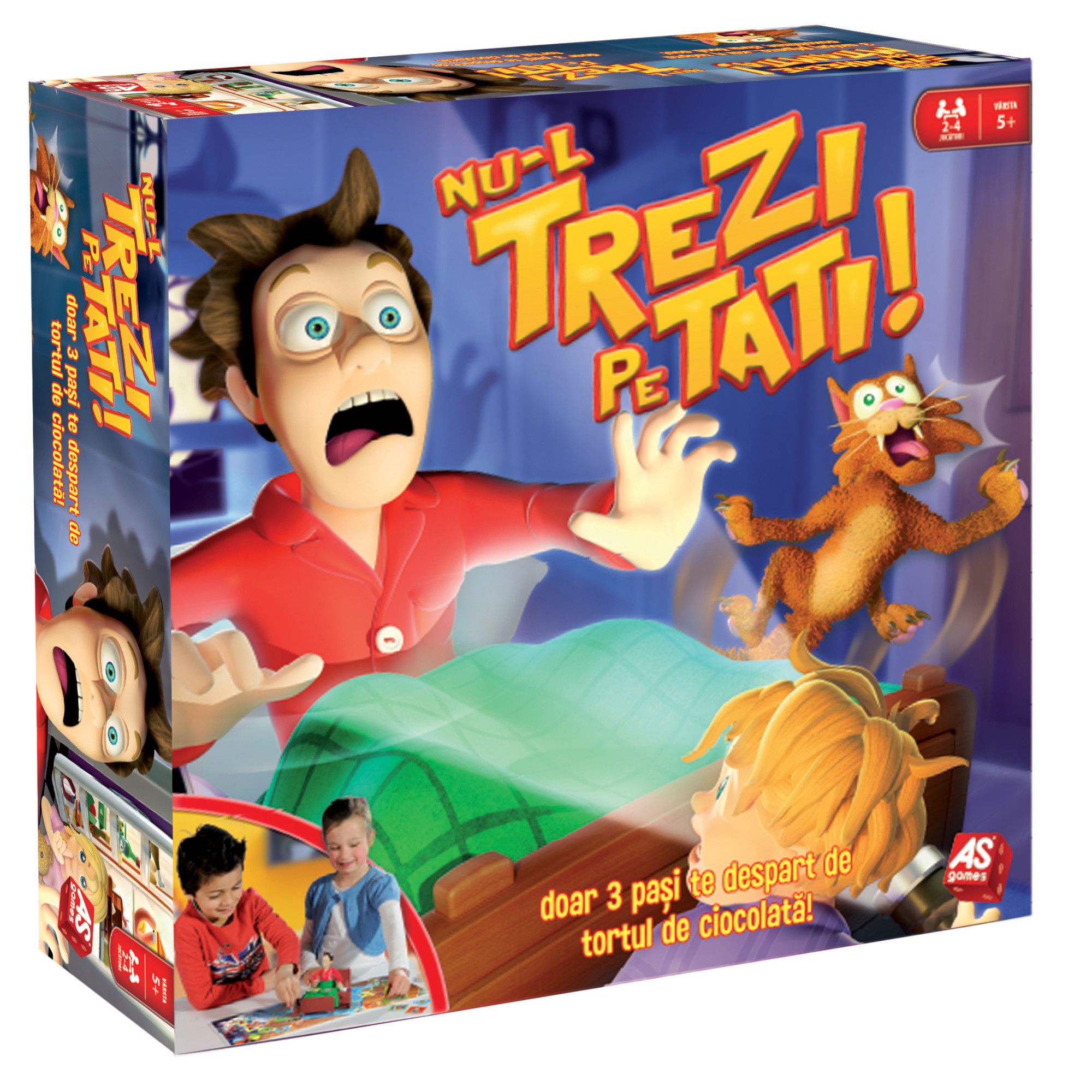 Pazea, vei avea multe obstacole. Un pas gresit il poate trezi pe tati si va fi foarte suparat. Jocul contine: "tata"electronic; tabla de joc;16 cartonase; 4 pioni;