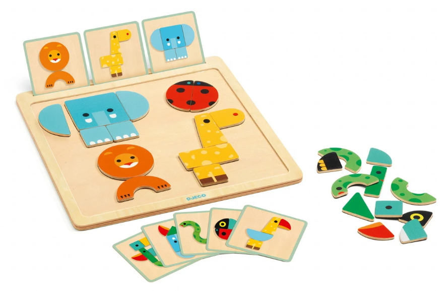 Un joc magnetic din lemn pentru realizarea a 16 animale diferite cu piese magnetice. Copiii pot realiza pe tablă animalele prezentate pe cartonașele model folosind piesele ilustrate colorate.