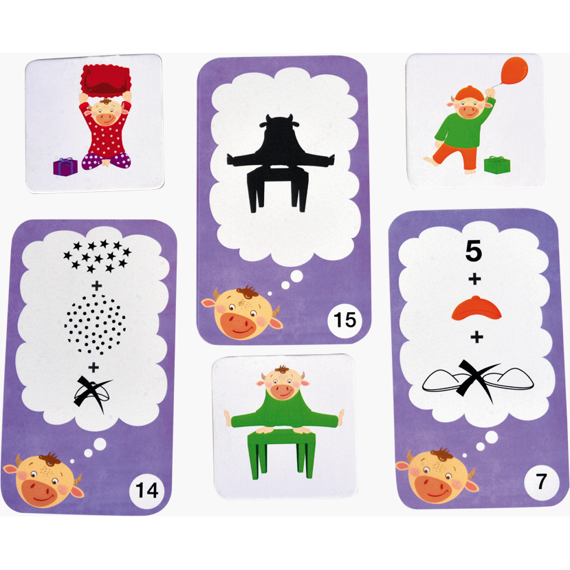 Regulament: Cele 21 de jetoane cu prietenii lui Marvin sunt imprastiate cu fata in sus pe o suprafata dreapta. Jucatorul care striga cel mai tare “Moo” incepe primul jocul. El trebuie sa dea cu ambele zaruri. Toti jucatorii incep sa caute cardul cu vacuta imbracata in combinatia de culori indicata de zaruri. Primul jucator care atinge jetonul cu vacuta respectiva il castiga. Jocul se incheie cand jetonele se termina. Jucatorul cu cele mai multe jetoane cu vacute este castigator. A doua varianta de joc presupune sa gasesti primul vacuta, bazandu-te pe caracteristicile si cerintele indicate de cardurile cu probleme de logica. Cele 21 de jetoane cu prietenii vacutei Marvin Moo sunt imprastiate cu fata in sus pe o suprafata dreapta. Amesteca cardurile cu probleme de logica si asaza-le teanc cu fata in jos. Jucatorul care striga cel mai tare “Moo “ incepe jocul si trage un card cu o problema de logica din teanc. Toti jucatorii incep sa caute jetonul cu vacuta care are caracteristicile indicate de card. Spre exemplu, daca pe card vei gasi o stea si cifra 6, trebuie sa cauti un jeton cu 6 obiecte si o vacuta care este imbracata intr-o pijama cu stea. Primul jucator care atinge jetonul corespunzator il ia si il arata celorlalti. Daca alegerea este corecta, jucatorul pastreaza cardul cu problema de logica si pune la loc jetonul. Jocul ia sfarsit cand toate problemele de logica au fost rezolvate. Jucatorul care a strans cele mai multe carduri castiga.