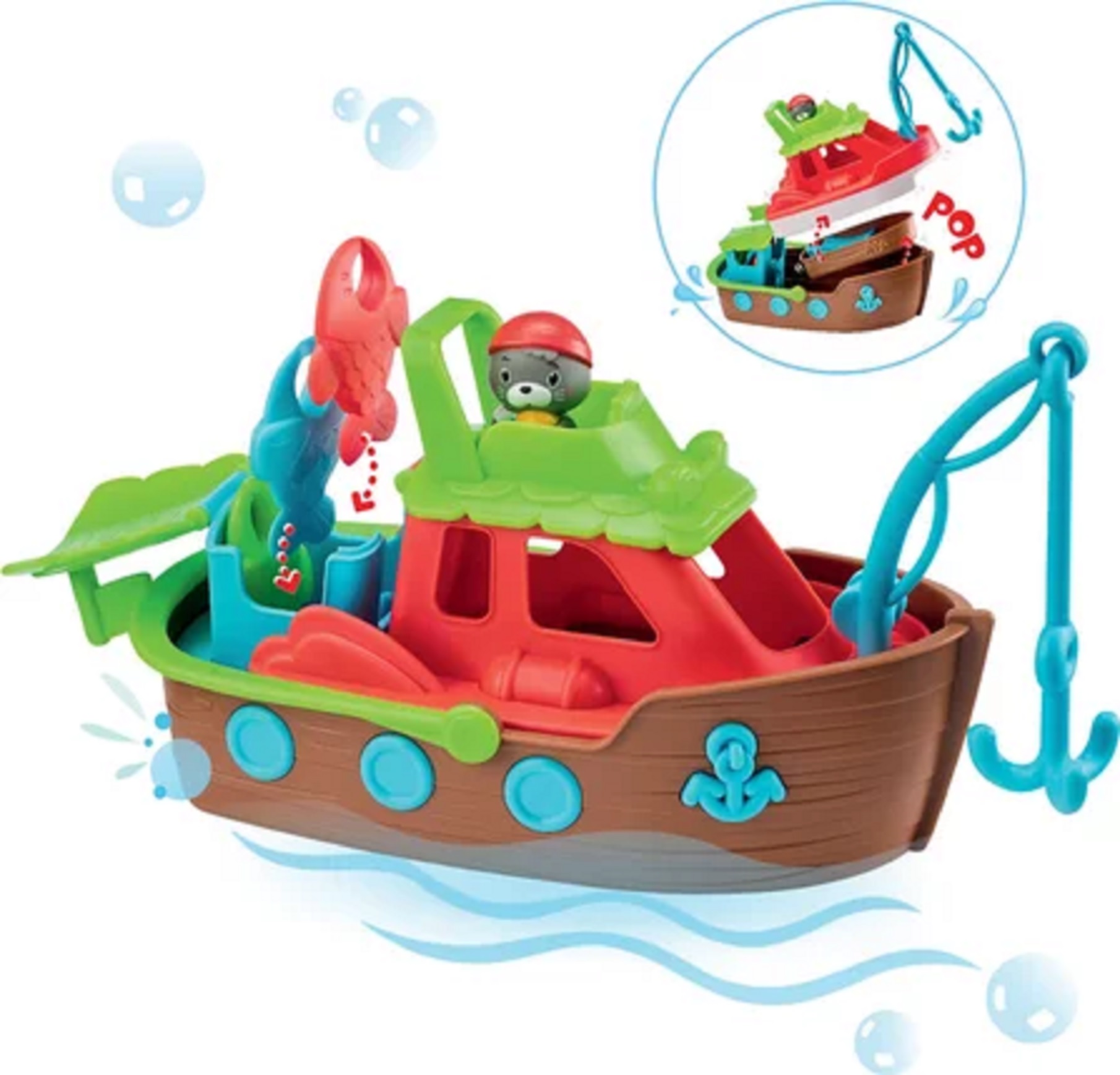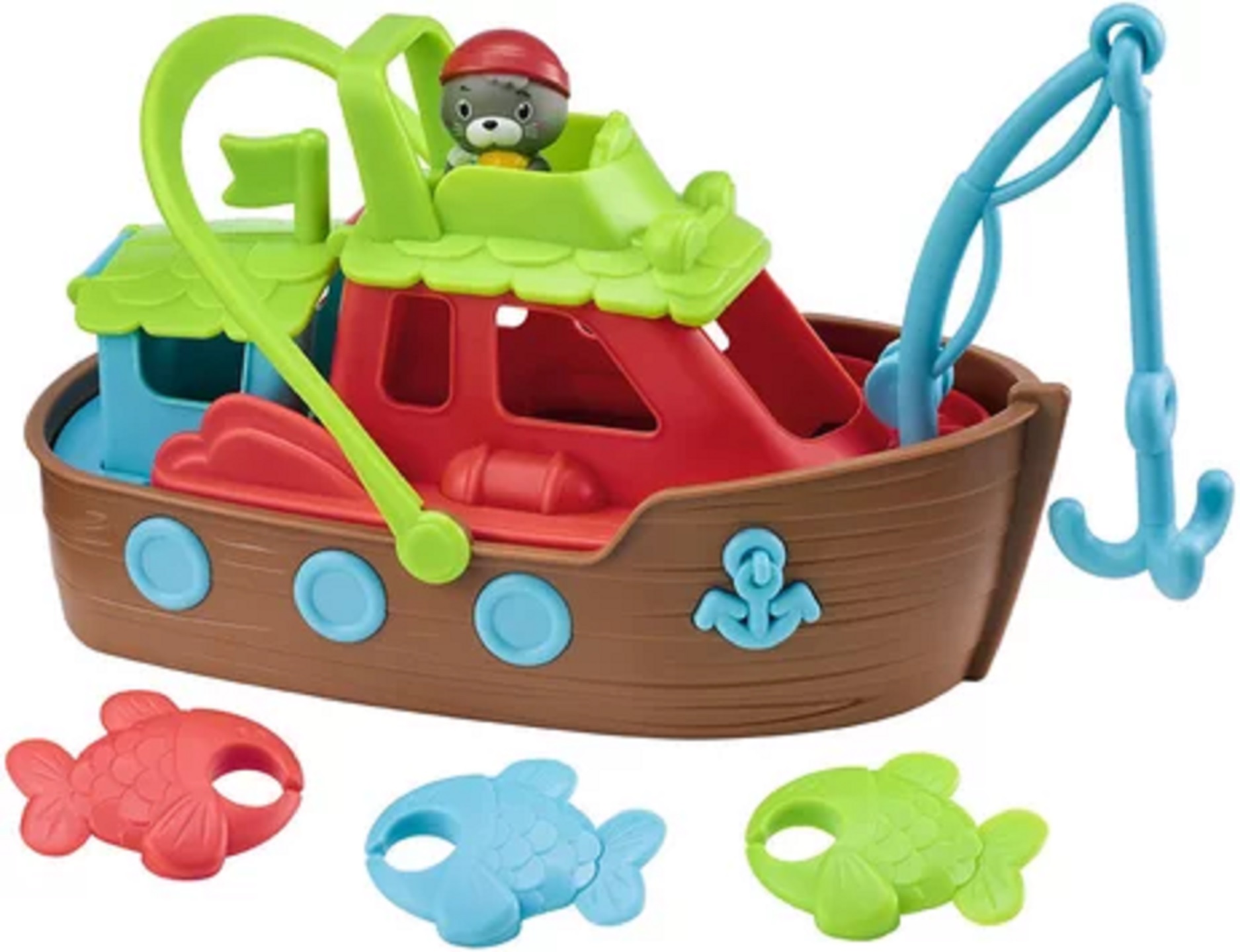 În jucăria ”La pescuit”, există trei jucării de baie pliabile din seria Klorofil, noi de la producătorul Sophie Girafa. La fel ca toate jucăriile Klorofil, carcasa mare de pescuit are o mulțime de surprize și caracteristici cu care să te joci. Cutterul se pliază într-o barcă mare cu o casă în care locuiește Mors Malo sau în care poți pune pește prins, o barcă de pescuit mai mică cu un șarpe și o barcă cu pânze mică. Fiecare navă are părți mobile. Pachetul include si trei pesti colorati care pot fi prinsi din barca de pescuit. Jucaria are un maner care faciliteaza transportul cutter-ului pentru baie dupa ce se joaca in camera, o duce la bunici sau la plaja.