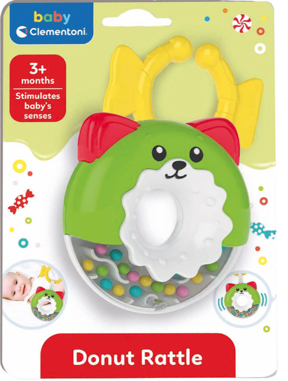 O zornăitoare în formă de gogoașă glazurată, cu texturi de mușcat și un inel practic pentru a agăța zornăitoarea de pătuț sau cărucior.