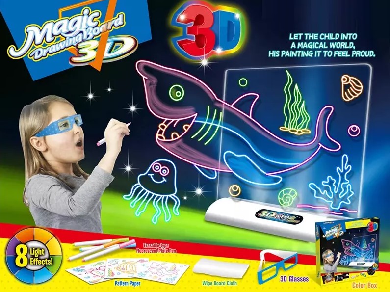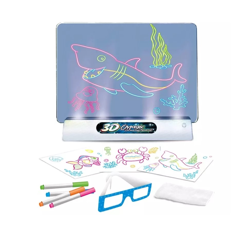 Suportul tablei de desenat contine LED-uri care genereaza lumina, astfel incat efectul de fluorescenta sa fie fenomenal si impreuna cu ochelarii 3D fiecare desen va prinde viata si astfel va incepe aventura.