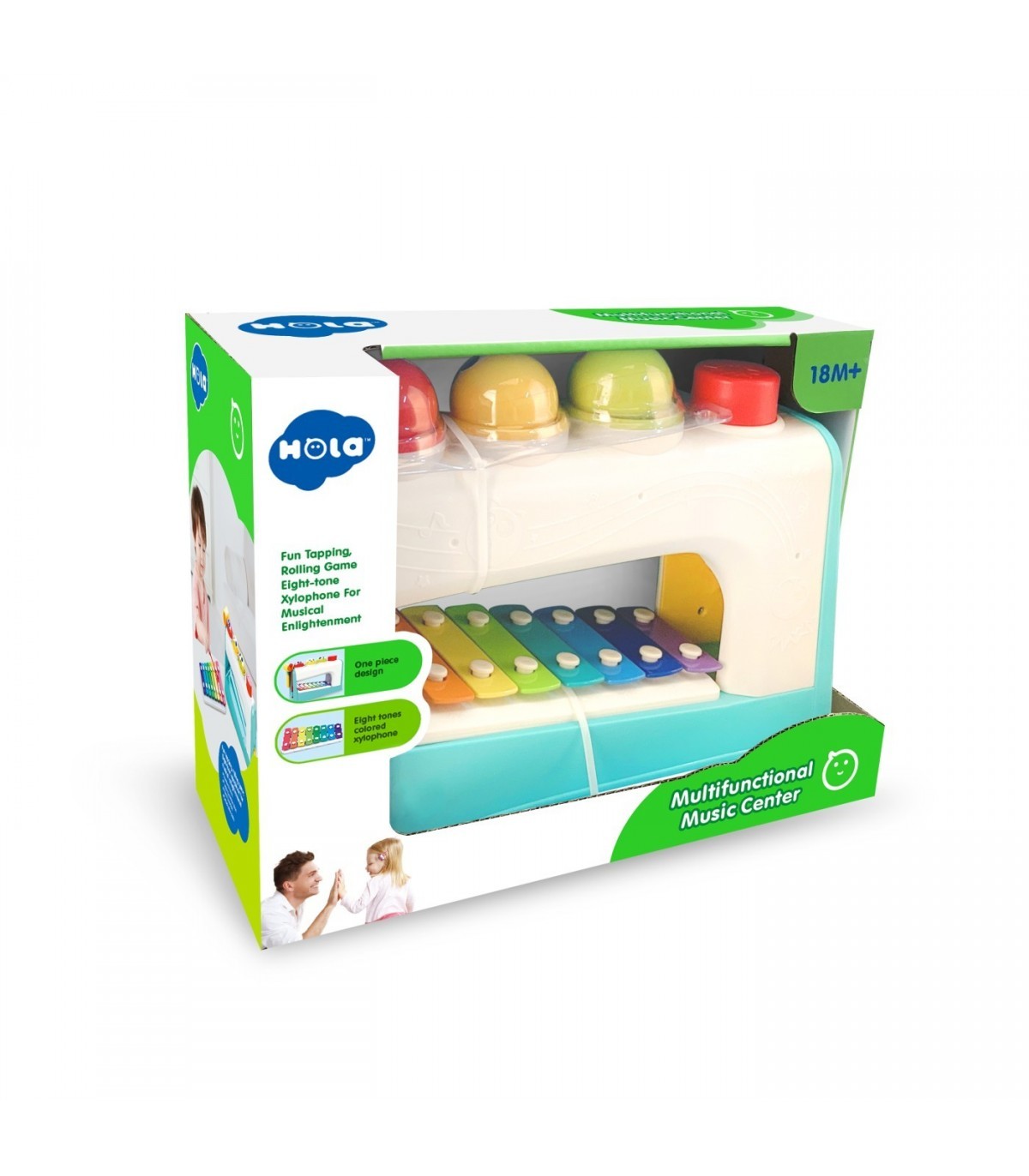 Centru muzical multifunctional cu xilfon, bile si ciocan. Xilofonul are 8 tonuri si poate fi scos din centrul muzical pentru a invata notele si a canta mai usor la el. Jocul de rulare al mingiilor permite bebelusilor sa-si dezvolte abilitatile de urmarire vizuala. Jucaria ajuta la dezvoltarea gandirii logice, a dexteritatii si a abilitatilor motorii.
