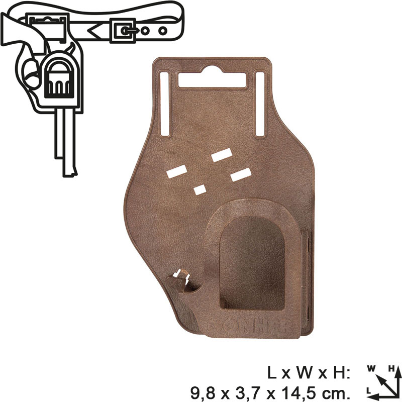 Revolver tip cowboy din metal și toc pentru cartușe din plastic. Folosește capse cu 12 focuri. Fabricat în Spania.