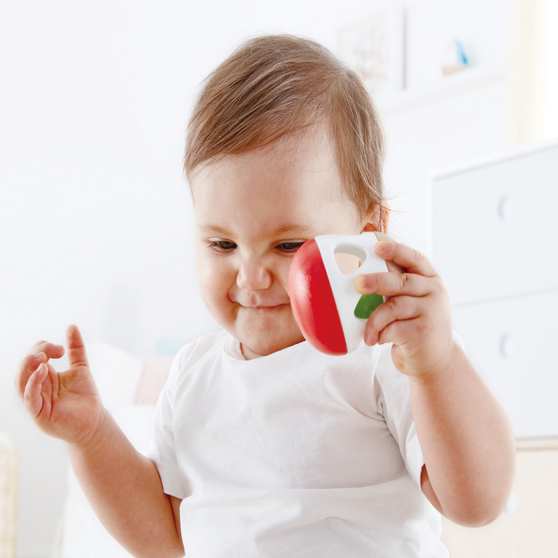 Este o zornaitoare in forma de ou, cu un clopotel inauntru care suna cand este scuturata. Deschiderile laterale faciliteaza apasarea si impingerea bebelusilor de-a lungul podelei Jucariile sunt realizate din lemn, folosind materiale ecologice, vopsite in culori atragatoare cu vopsele nontoxice, care depasesc cele mai inalte si stricte standarde internationale de siguranta si calitate, precum EN71, ISO9001, ASTM F963 si altele.
