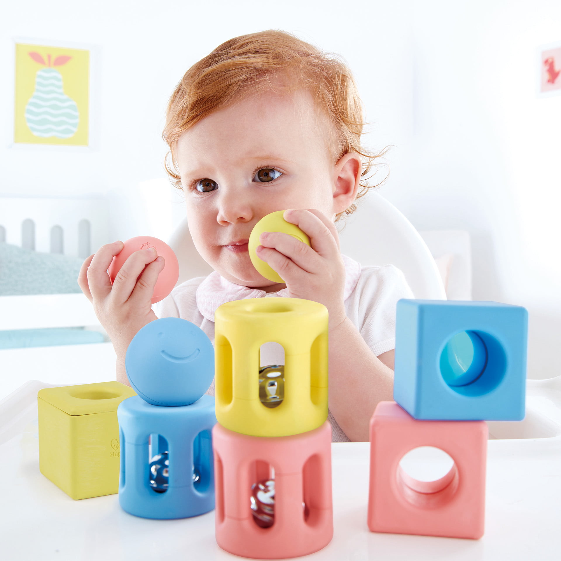 Zornaitoarele in forme geometrice, sunt proiectate in mod special pentru a se potrivi perfect in mainile celor mici si ii va ajuta sa-si imbunatateasca considerabil intelegerea de catre copil a relatiilor cauze si efect, precum si coordonarea mainilor si ochilor, atunci cand sunt agitate. Agitati-le pentru a va distra bebelusul cu sunetele pe care le emit. Pe masura ce copiii cresc, incurajeaza-i sa incerce cateva activitati de stivuire si sortare.