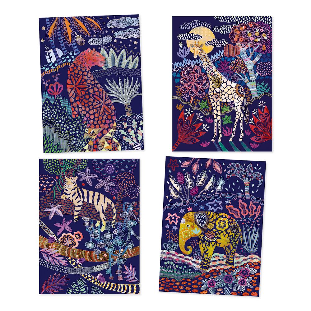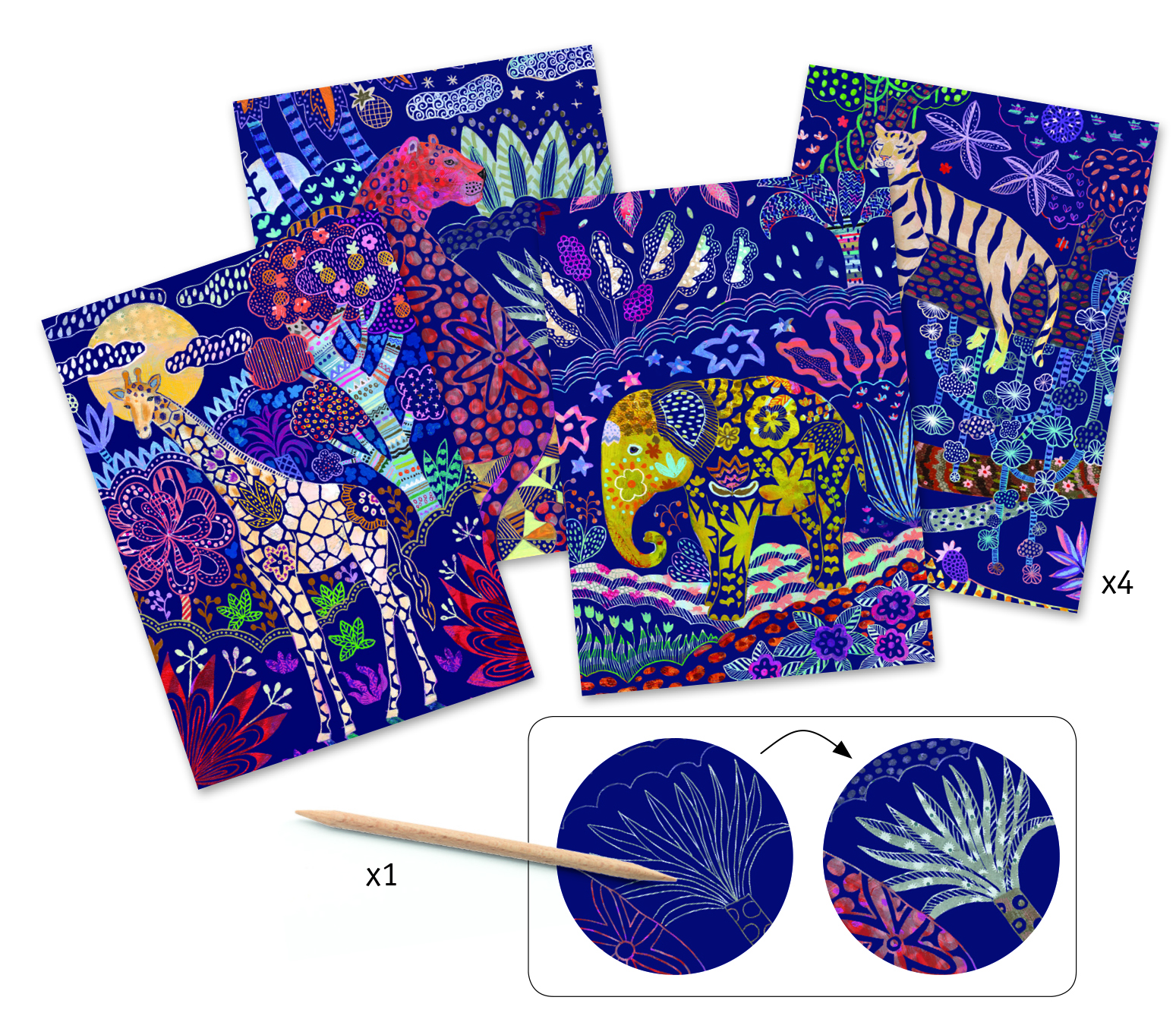 Scenele din jungla luxuriantă cu animale exotice prind viață pe măsură ce designul este dezvăluit prin răzuire.