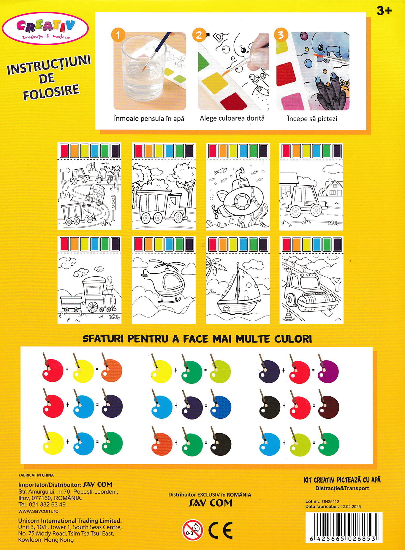 Kitul conține 8 pagini care conțin imagini pentru pictat, 6 culori pe fiecare pagină și o pensulă.